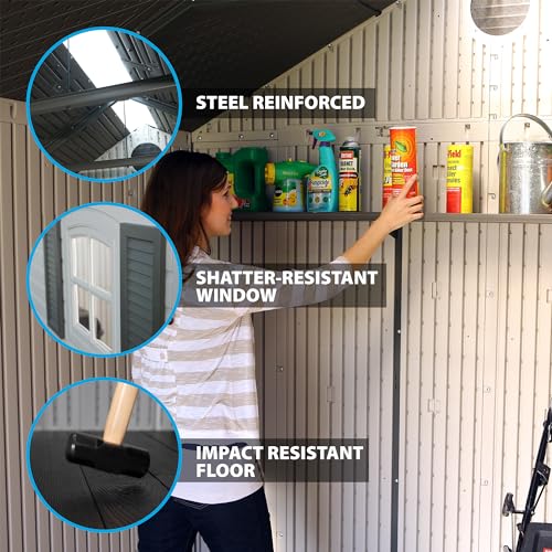 Details: Lifetime's 8 x 10 Foot Outdoor Storage Sheds are the perfect solution to your storage needs. Built with durable, dual-wall high-density polyethylene, our sheds are steel-reinforced and low-maintenance. With various features including a shatter proof window, skylight, custom shelving, and much more, a Lifetime Shed is the perfect addition to your backyard. The Lifetime 8 ft. x 10 ft. storage shed features: (1) full-length ridge skylight, (1) shatter-proof window, (2) screened vents, (1) shutter set, (1) 90 in. x 9 in. shelf, (4) decorative corner trims, and a 10-year limited warranty. Floor Included. Comes in (2) boxes.