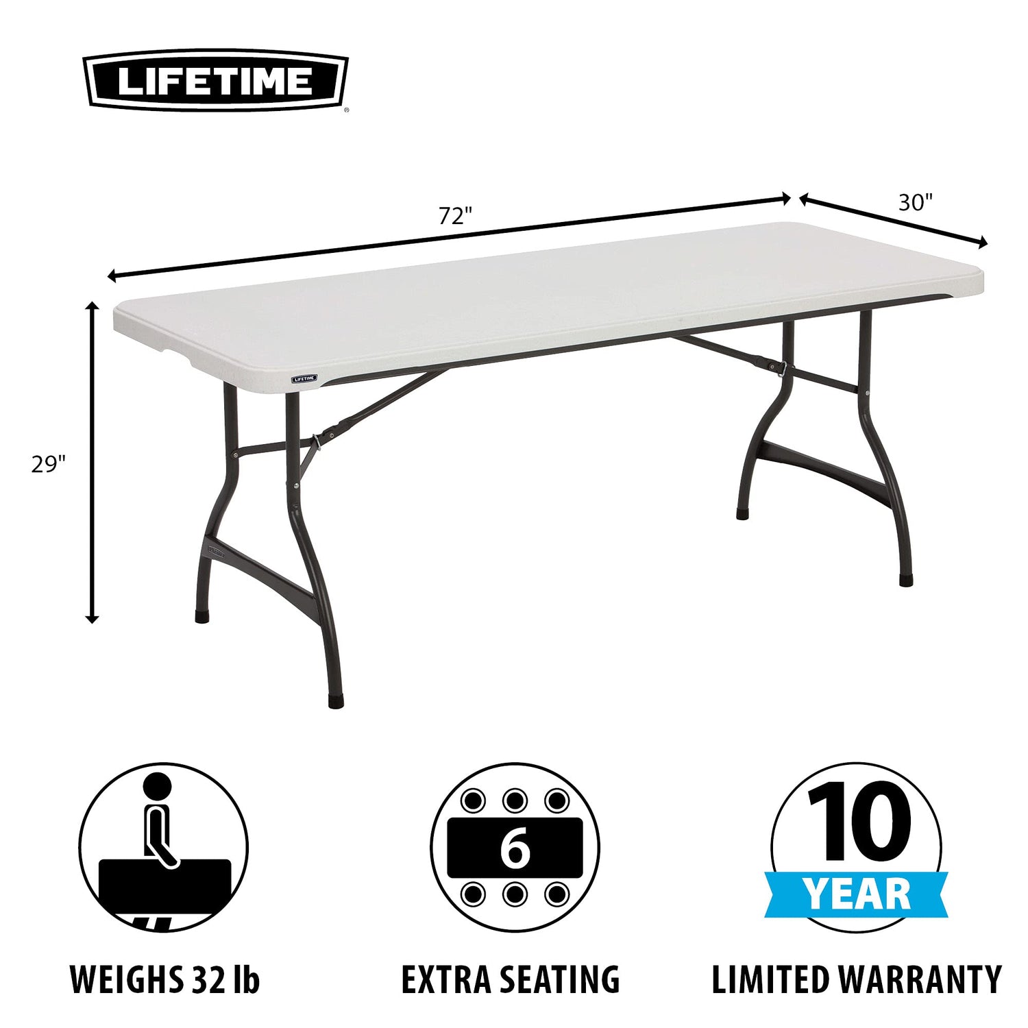 Details: Lifetime 6-Foot Commercial Folding Tables are constructed of high-density polyethylene and are stronger, lighter and more durable than wood tables. The innovative nesting design lets multiple table stack together for space saving storage. Our tables are UV-protected with all-weather construction for both indoor and outdoor use. The patented steel frame design provides a sturdy foundation and is protected with a powder-coated, weather-resistant finish. Our High Strength Low Alloy (HSLA) Steel creates a lighter table with increased strength and stability. Built for the rigors of heavy-duty commercial use, Lifetime Folding Tables exceed challenging BIFMA standards and are backed by a ten-year warranty.