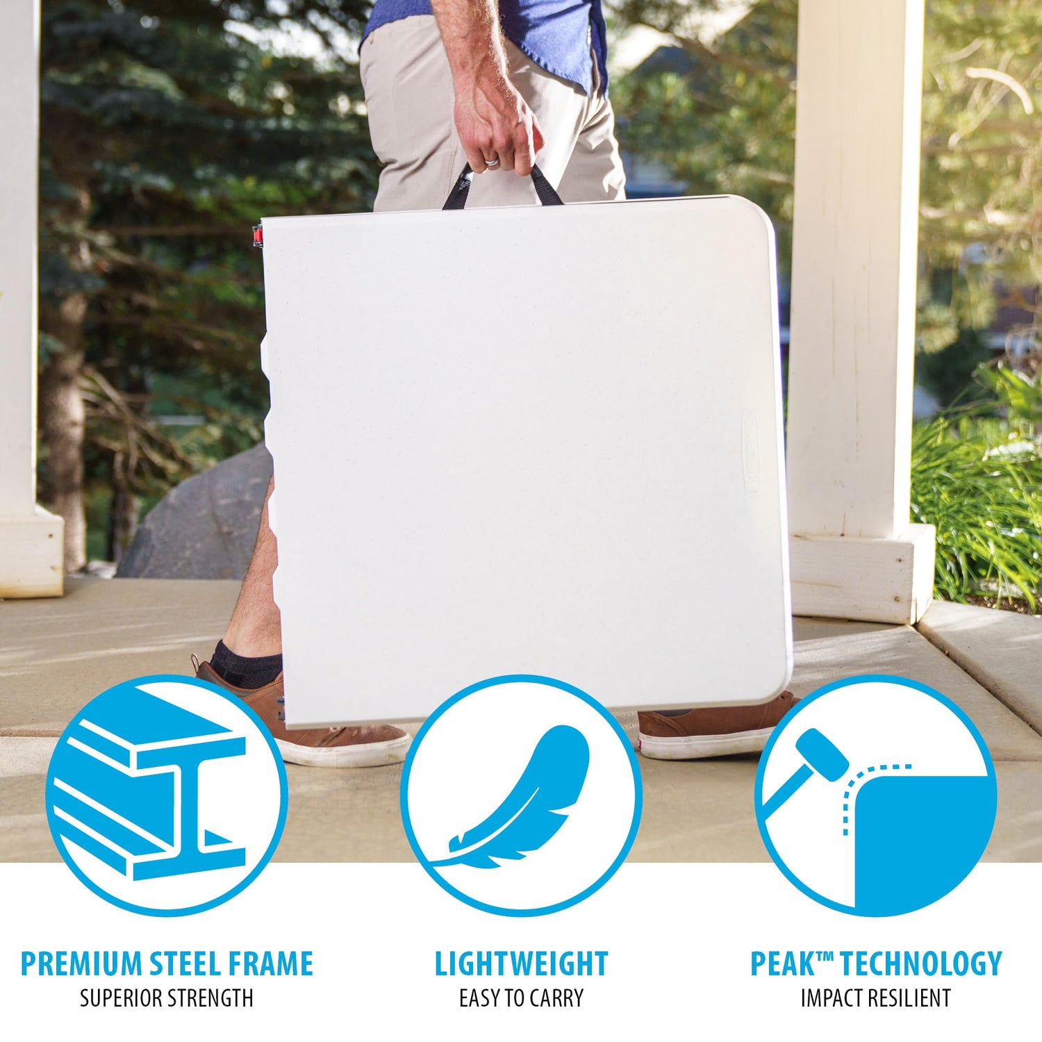 Details: When you need extra table space in your home, Lifetime’s 4-Foot Light Commercial Fold-In-Half Table is the perfect option. Whether you want to work on crafts or set some snacks out at a party, this table is a versatile solution for any household. Save space while storing and transporting it easily using the lightweight fold-in-half design. The wide edge openings and premium handle make unfolding it a breeze. Raise and lower the table to ideal height quickly and easily with the intuitive single-hand adjust. Never worry about cracks, chips, and peeling—the table is UV protected, rust resistant, and stain resistant, and has improved dent-resistant edges. Enjoy convenience and durability for years with the Lifetime 4-Foot Fold-In-Half Table, the perfect setting for an evening with your family and friends.