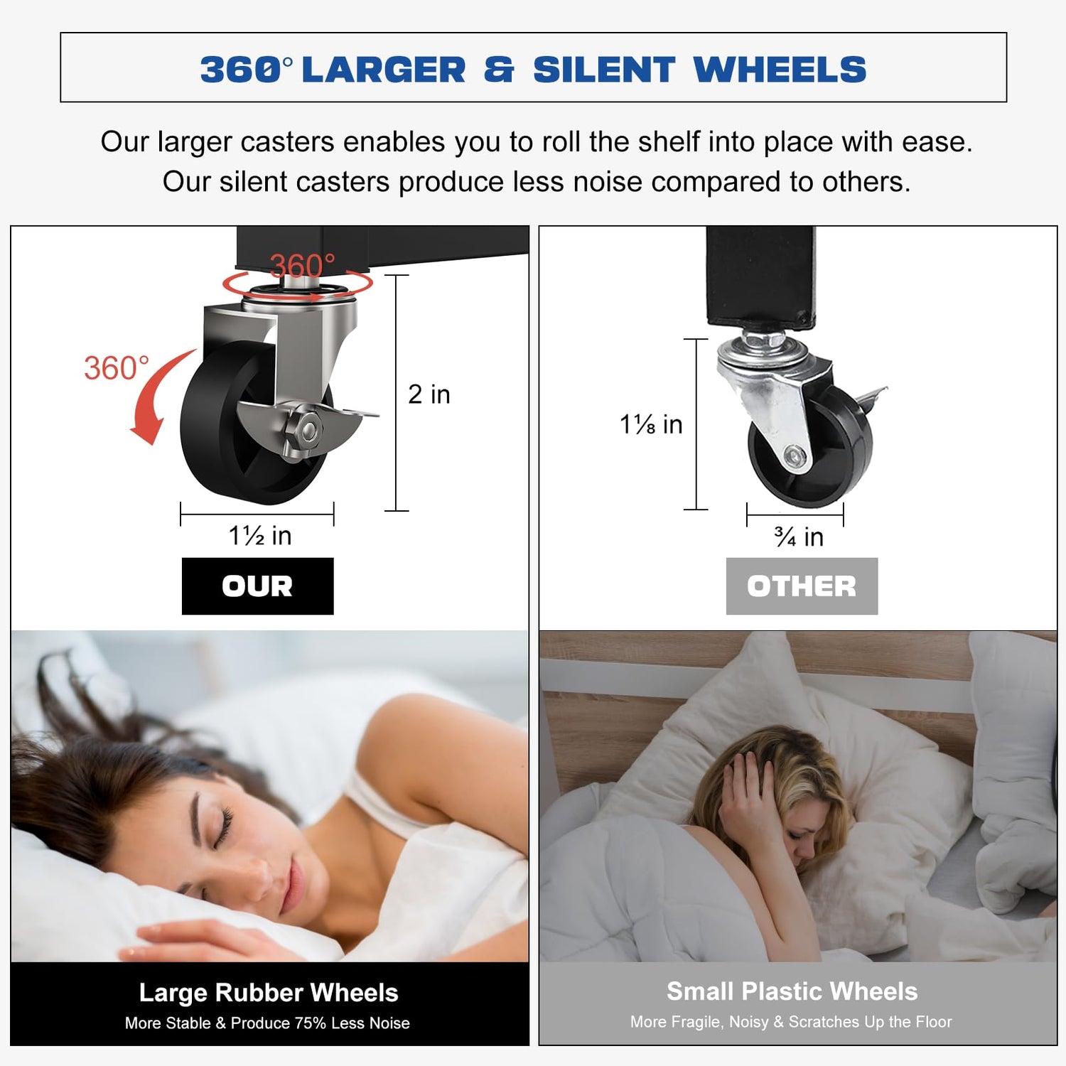 - ✅【 Extra Durable & Light】This folding shelf is made of heavy duty materials able to store up to 90 lbs on each level. It is scratch-resistant, waterproof, and rustproof, ensuring its durability to last through many years of long term use. This cart is equipped not only with silent wheels that enable quiet shelf movement, but also features larger wheels that make moving heavier items on the shelf much easier. Wheels are lockable, removable, and offer 360 degrees of movement.