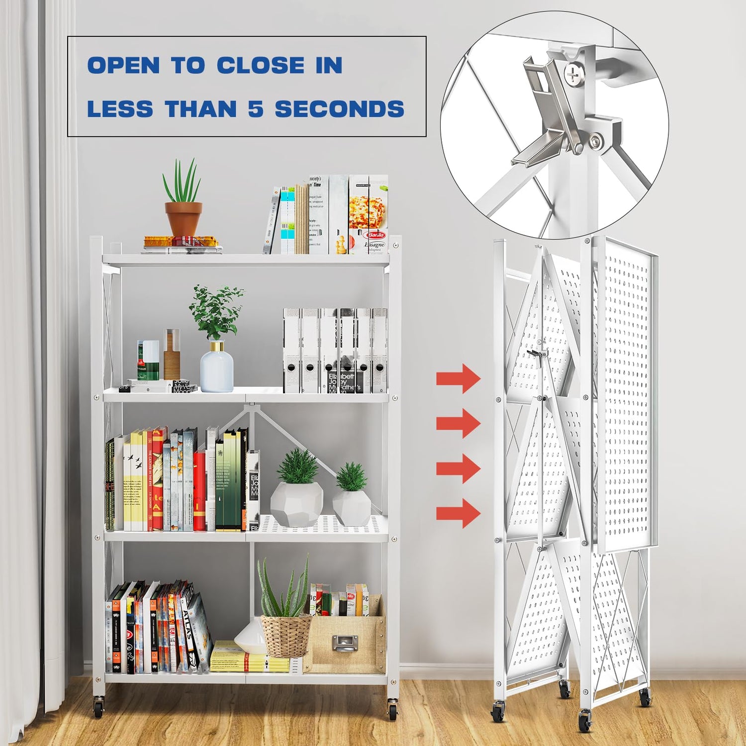 Lifetime Home 4-Tier Foldable Storage Shelf with Wheels - Metal Collapsible Shelving Unit Display, Rolling Cart for Books Kitchen Storage Shelves, Pantry & Closet Organizer, Office Room Decor - White