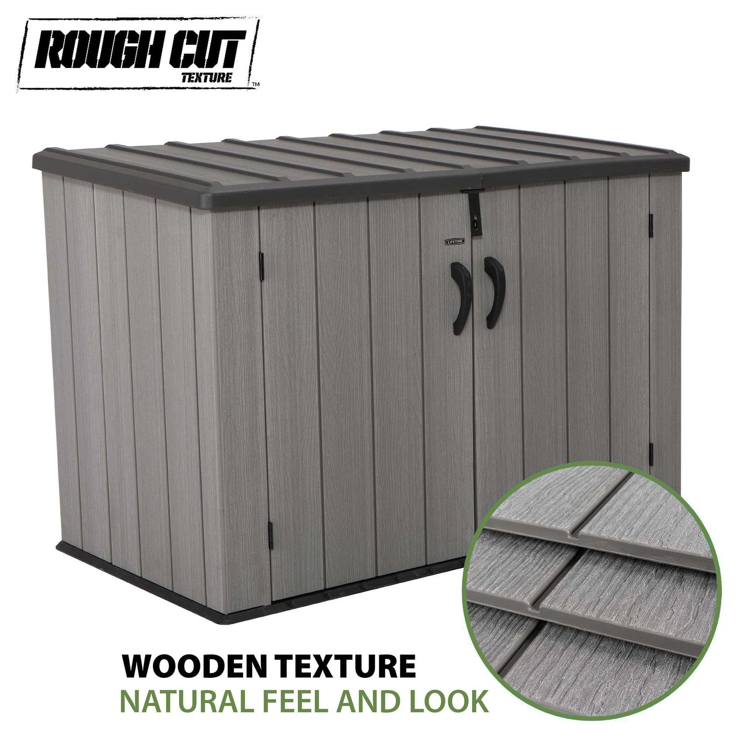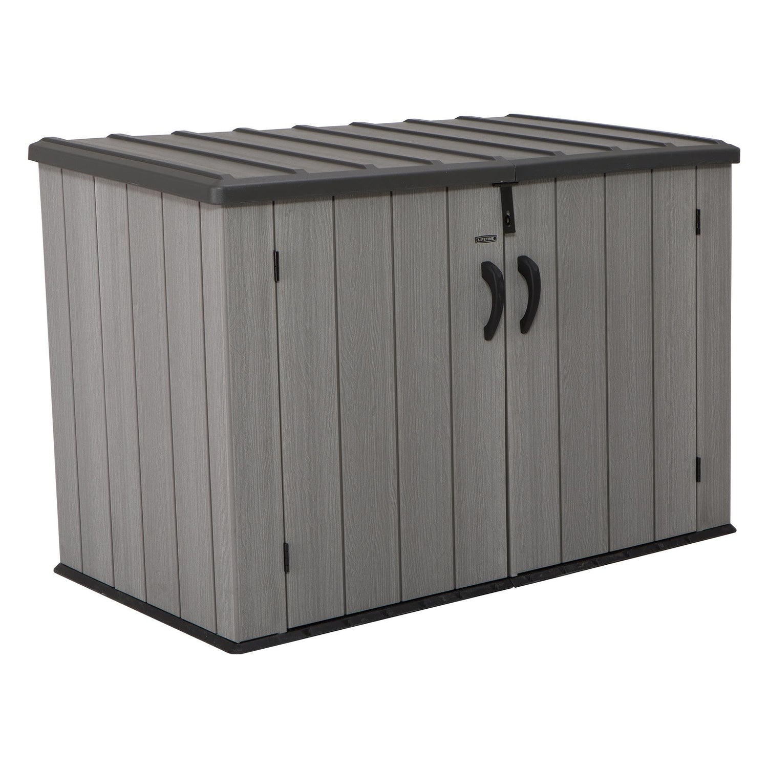 Details: Need a more convenient place to store items around your yard? Lifetime’s Horizontal Storage Box Shed is the perfect way to expand your storage and get better access to items you use regularly. Whether you have tools, lawn equipment, bikes, or even trash bins, the Horizontal Shed makes them easy to store and find when needed. The panels feature a wood grain texture and natural appearance finish that is easy to maintain, requires no paint, and looks great in your yard. It is durable, UV-protected, and weather resistant to ensure your belongings have years of protection. The doors are steel reinforced and lockable (lock not included) to provide even greater security. The top lid with control spring hinge opens up easily so you can easily place or remove items inside. The Lifetime Horizontal Storage Box blends durability, convenience, and style to create the optimal storage solution.