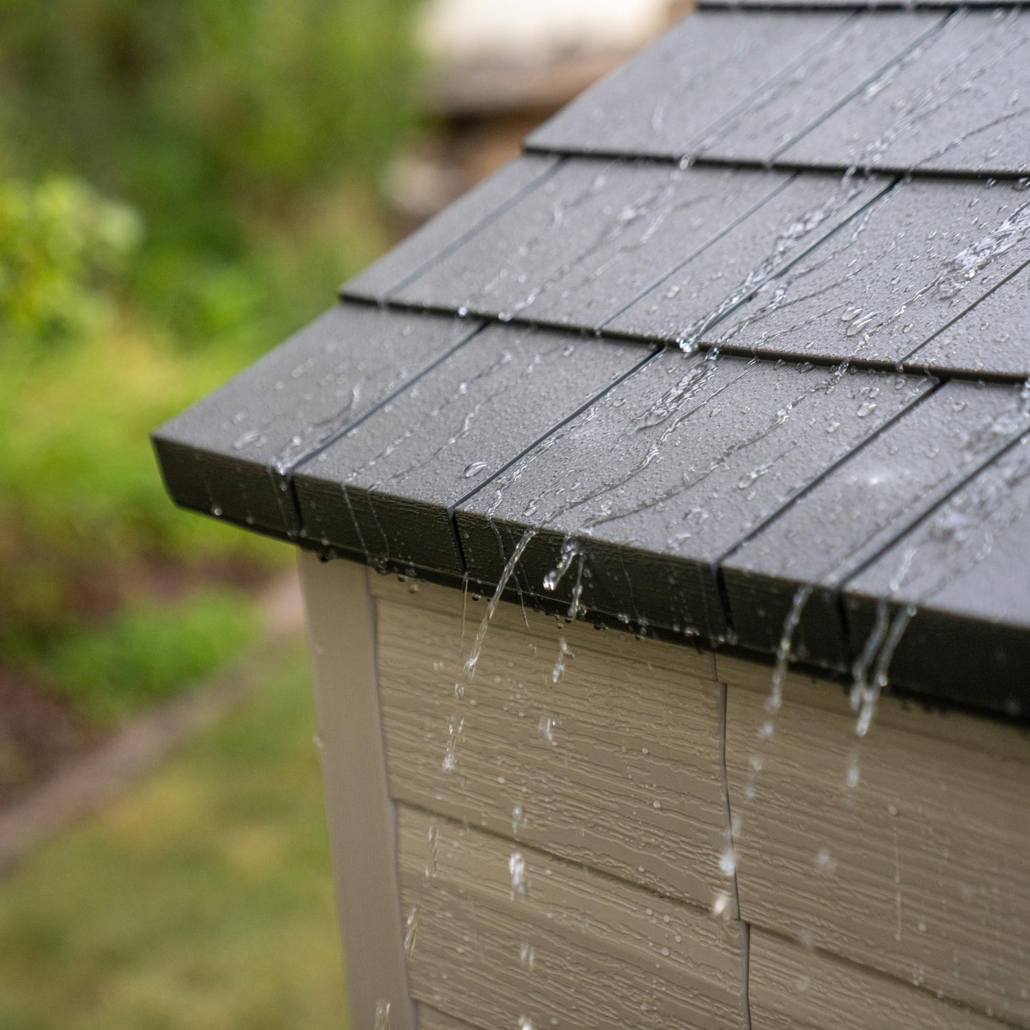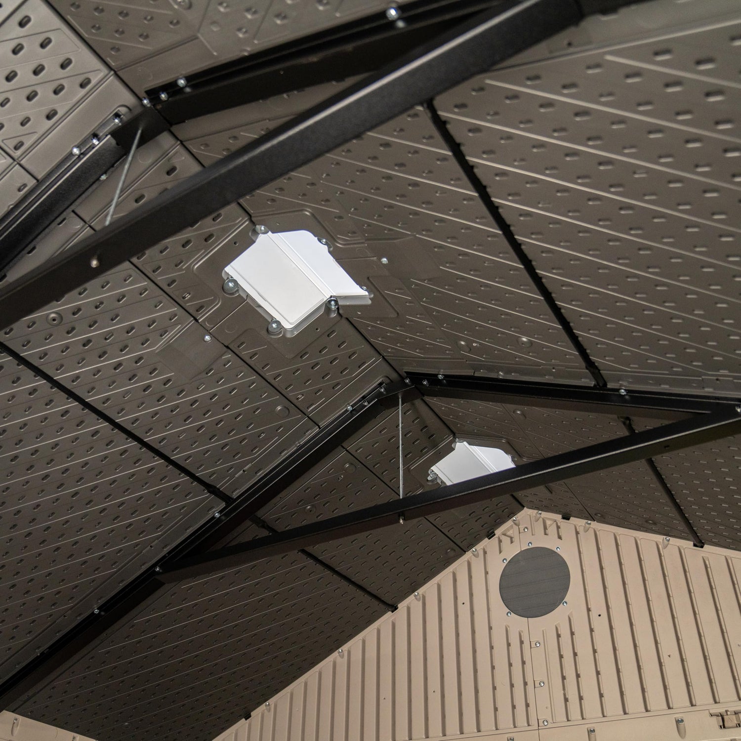 - Steel-Reinforced Walls: Designed with dual-wall high-density polyethylene (HDPE) panels with steel wall supports for added strength. | High-Pitched Roof: Steep angle allows for quick drainage of rain and snow, and provides a spacious walk-around interior. Heavy-duty steel trusses increase strength. | Door Handles: High-Impact Handles with Metal Latch