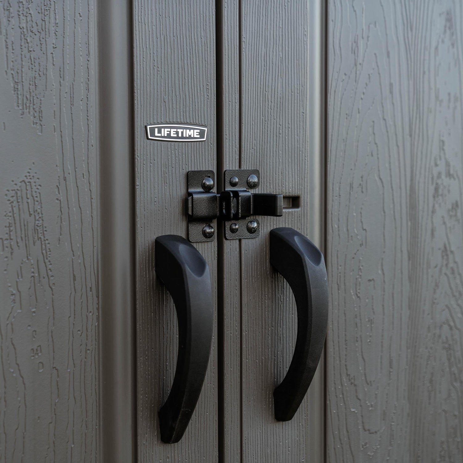 - Lockable Doors: Doors provide an extra-large opening, sturdy structure, and exterior padlock loop. | Door Hinges: Galvanized Steel Hinge Pins | Door Handles: High-Impact Handles with Metal Latch
