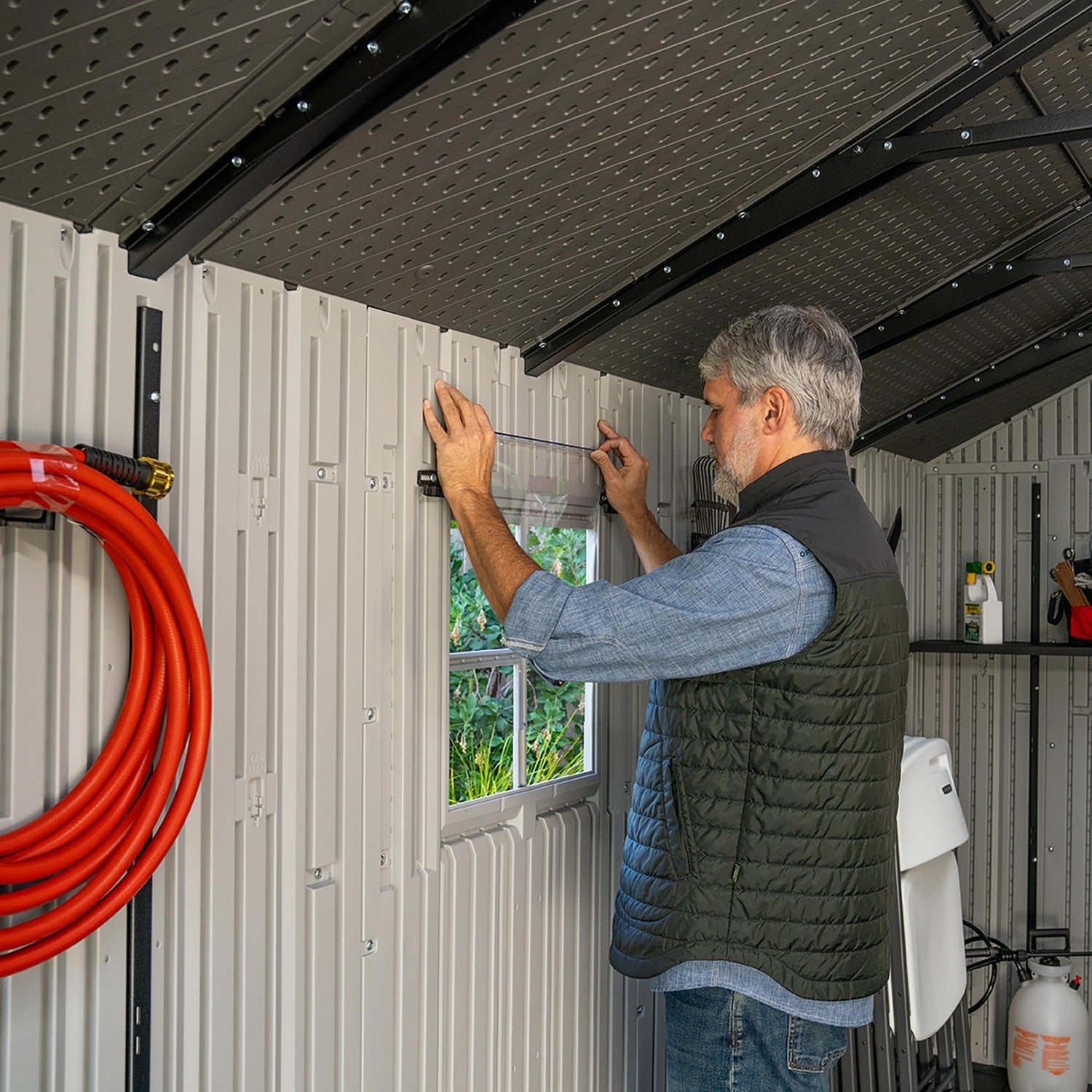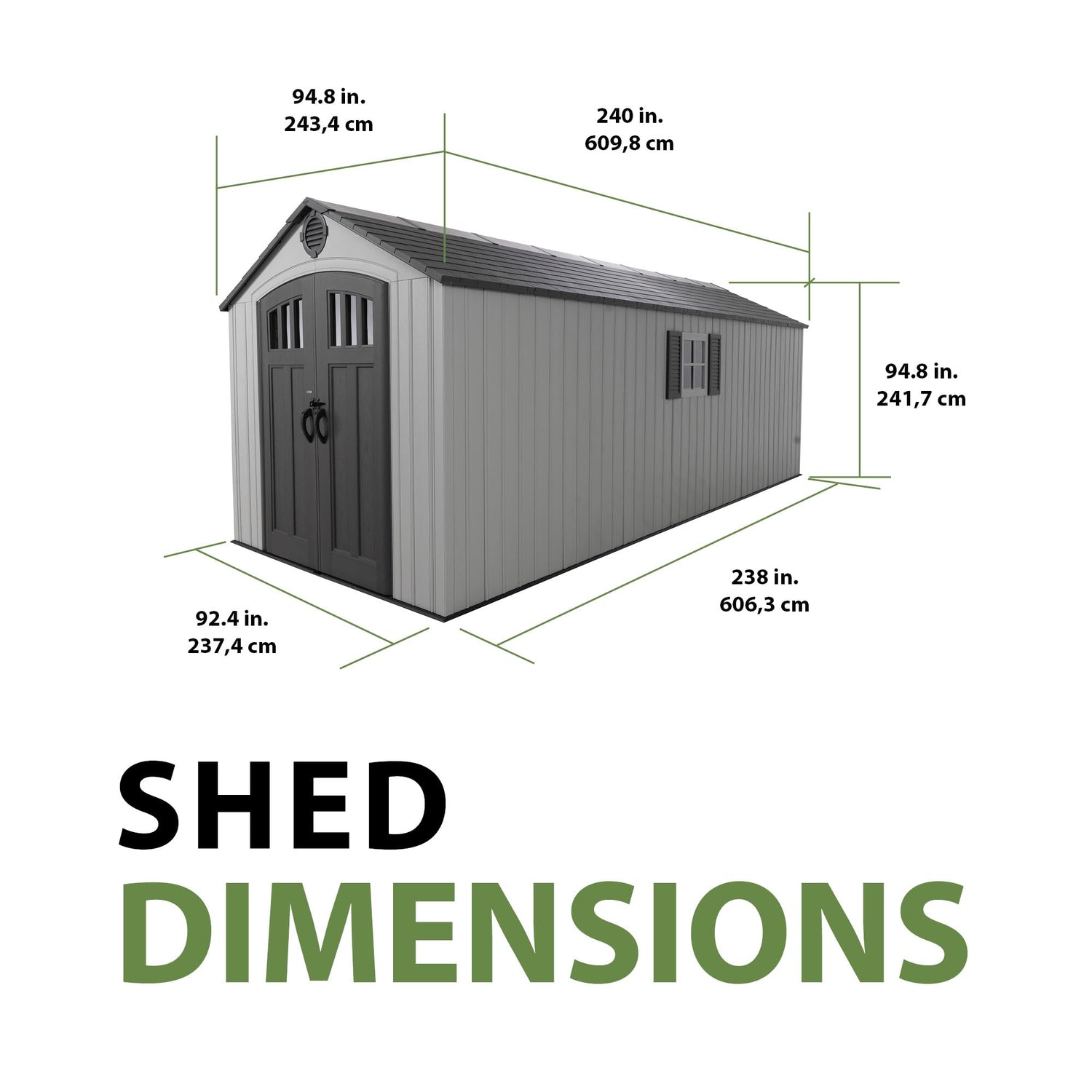 Details: When you want extra space for lawn and garden storage while accenting the beauty of your backyard, the Lifetime 8 x 20-Foot Storage Shed has the space, design, and features you need. Access your storage easily using the centralized location of the doors and customize the interior organization with an adjustable shelving system. Bask in the natural light granted by ridge skylights and secure your goods with a lockable steel latch on the doors. This shed is made with heavy-duty steel trusses, high-density polyethylene, and a sturdy Double Wall System for exceptional strength and reliability. A high-pitched roof allows for quick drainage of rain and snow, and UV-protected surfacing will prevent sun and weather damage, while the slip- and impact-resistant floors keep things low maintenance for you. With decorative shutters, molded wood-grain panels, and a simulated shingled roof, it boasts an attractive design that will look great in your yard. To keep your space organized, well maintained, and beautiful, try the Lifetime 8 x 20-Foot Outdoor Storage Shed and enjoy the yard you’ve always dreamed of. Includes (8) 30" Panel Skylights, (18) wall hooks, (2) screened vents, (1) 3-Pane door set, (1) Slide Bar Latch, (2) Deadbolts, (1) 90" fold in half, height-adjustable wall shelves, and (1) Fold in half shed floor (foundation not included), (2) windows.