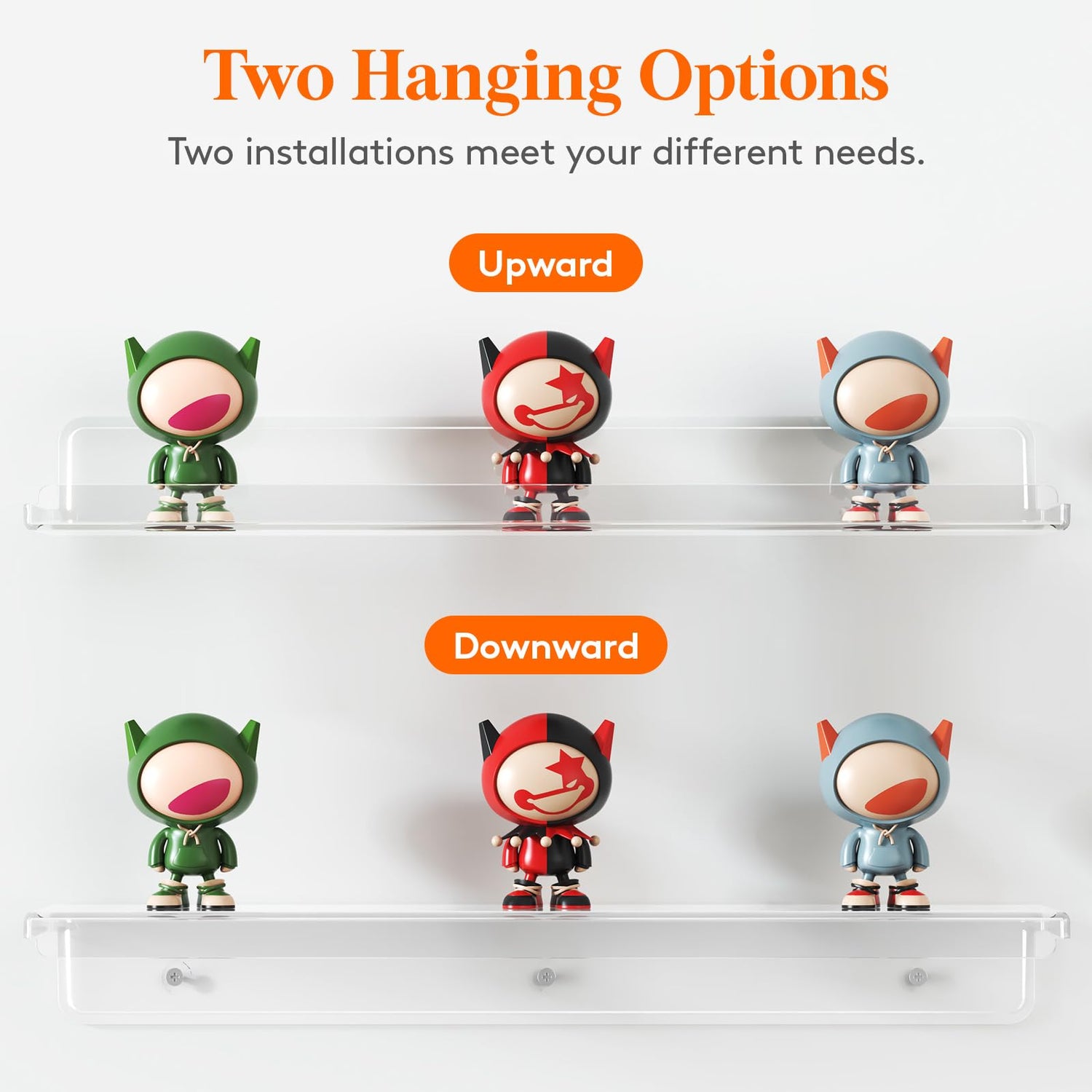 - 2 Ways to Install: The two hanging options are upward or downward. Acrylic shelves come with pre-drilled holes, detailed instructions, and all necessary mounting hardware, including screws, wall anchors, and bubble lever, which make installation simple and easy in just a few minutes.