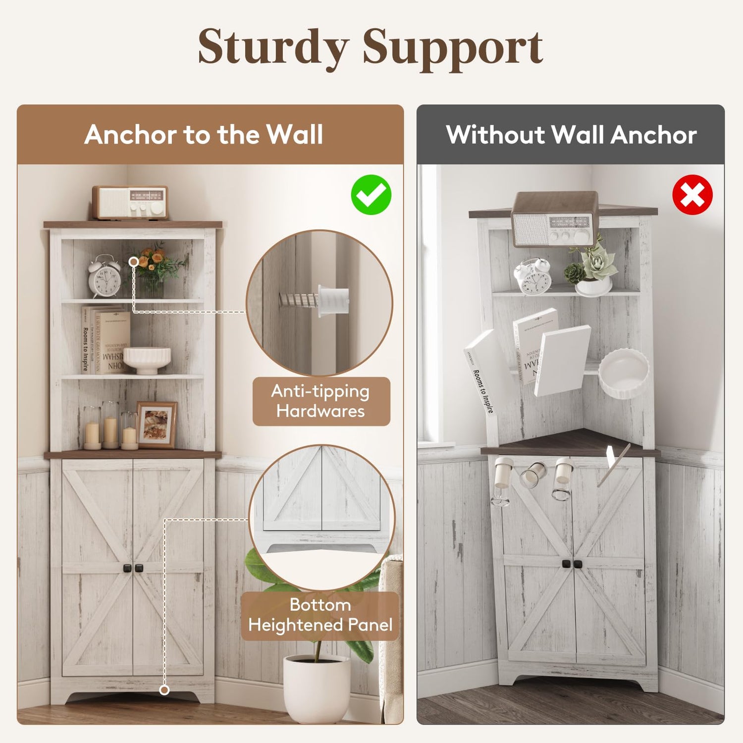- [STURDY SUPPORT] Comes with one sturdy support base and some tipping restraint hardware, so you could fix this corner cabinet to the wall and prevent it from wobbling or tipping over. Also, please make sure hardware is suitable for your walls before installing, as different wall materials may require different types of anchors