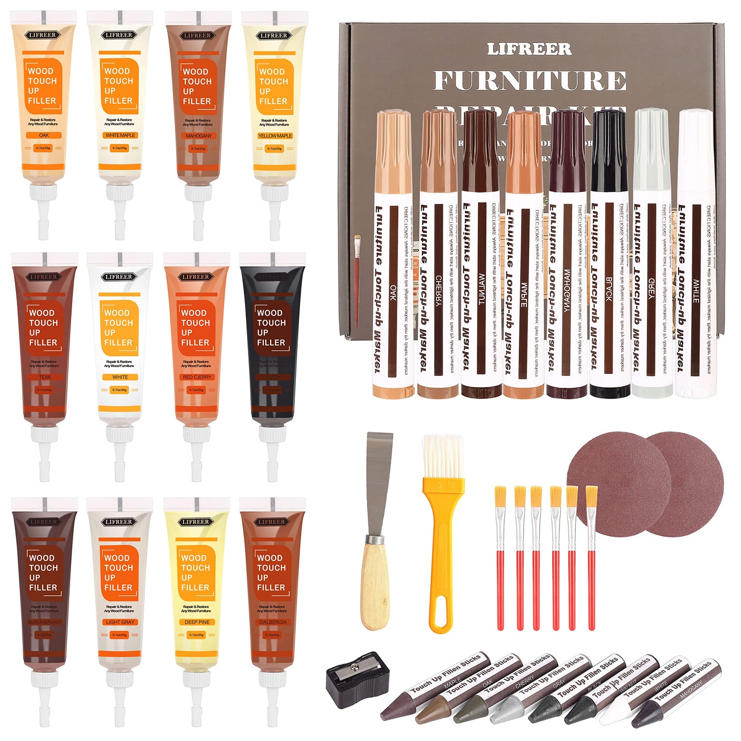 Lifreer Wood Furniture Repair Kit - 40 Pcs Wood Filler, Touch Up Markers with Wax Sticks - for Wood Floors, Stains, Scratches,Tables, Door,