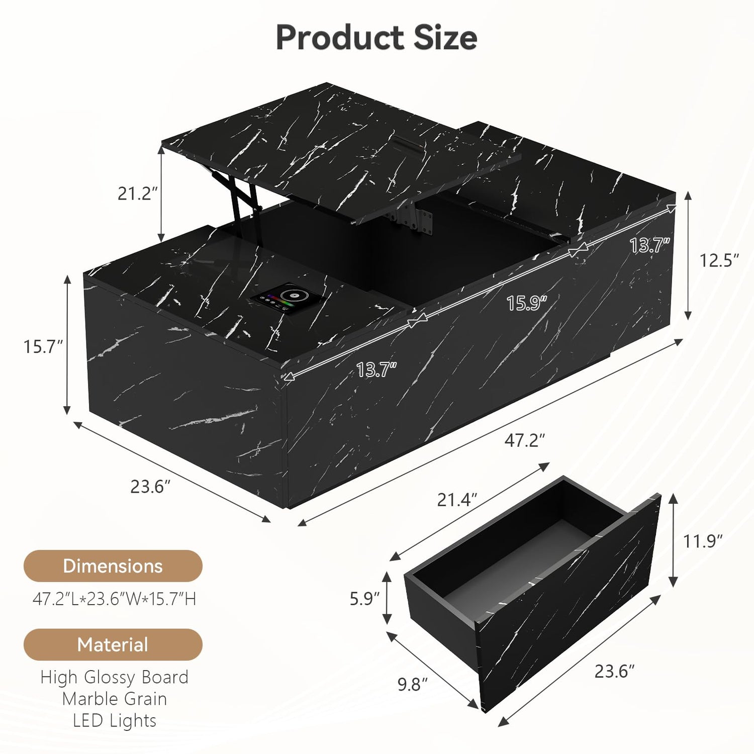 - Durable and High-Quality Construction: The coffee table with lifting top is crafted from premium MDF, designed for both durability and long-lasting use. The table's surface is waterproof, scratch resistant, and features a high-gloss marble finish, ensuring it maintains its sleek and elegant appearance even with daily use. The sturdy build can support up to 100 lbs, making it strong enough to hold a variety of items such as books, electronics, and décor without worrying about damage or wear over time. The marble-inspired finish adds a luxurious touch to any room, elevating the overall aesthetic of your home