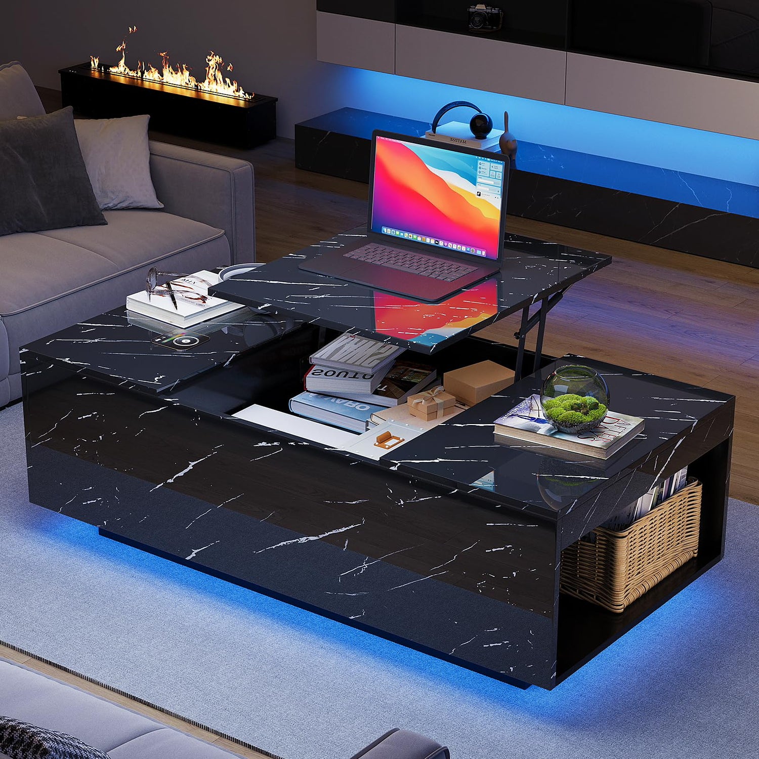 Lift Top Coffee Table, High Glossy Coffee Table with Wireless Charging and Speaker, Modern Coffee Table with 24 Colors LED Lights,Center Table with Drawer and Hidden Compartment for Living Room Black