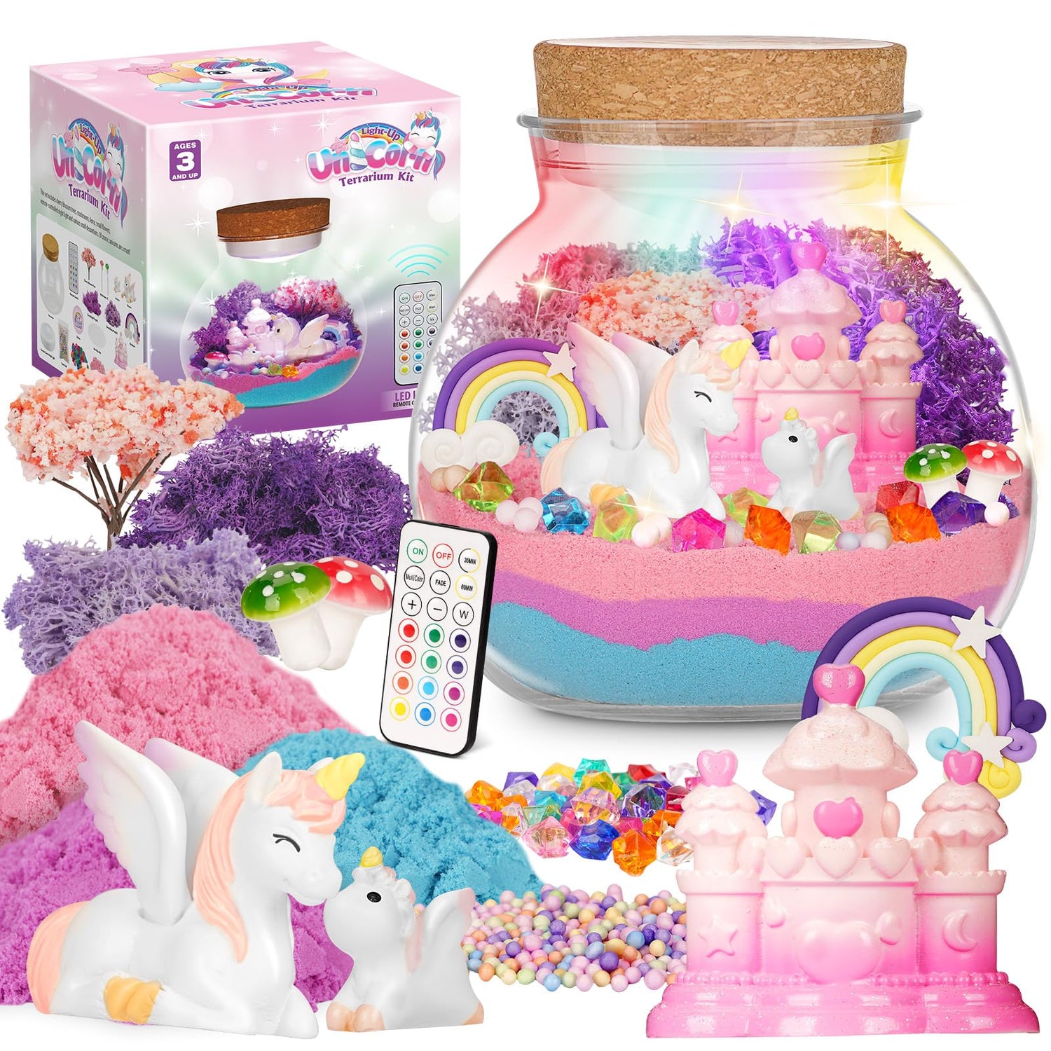 - Complete Unicorn Garden DIY Night Light Kit: Our unicorn terrarium kit for girls includes everything needed to create a magical unicorn fairy garden : clear jars, a 13-color LED night light, a remote control, adorable unicorn figures, sparkling crystals, magic sand, cherry blossom trees, flowers, mushrooms, and more decorative ornaments. This comprehensive set provides your child with a delightful and imaginative crafting experience