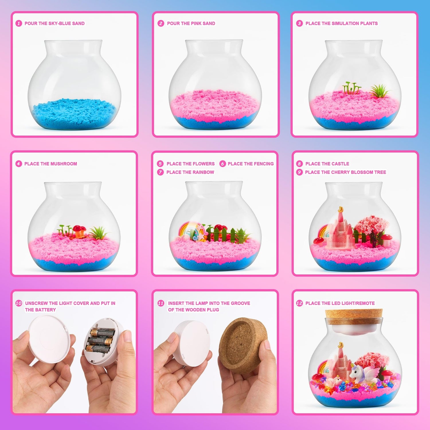 - đŚăCOMPLETE UNICORN TERRARIUM KITă: Our light up unicorn terrarium kit includes clear jars, 13-color LED night light with remote, , unicorns, castles, rainbow, Gemstones, Space Sands, Cherry Blossom Tree, Flowers and more decorative accents. The accessories-rich set includes everything kids need to create a unicorn garden.