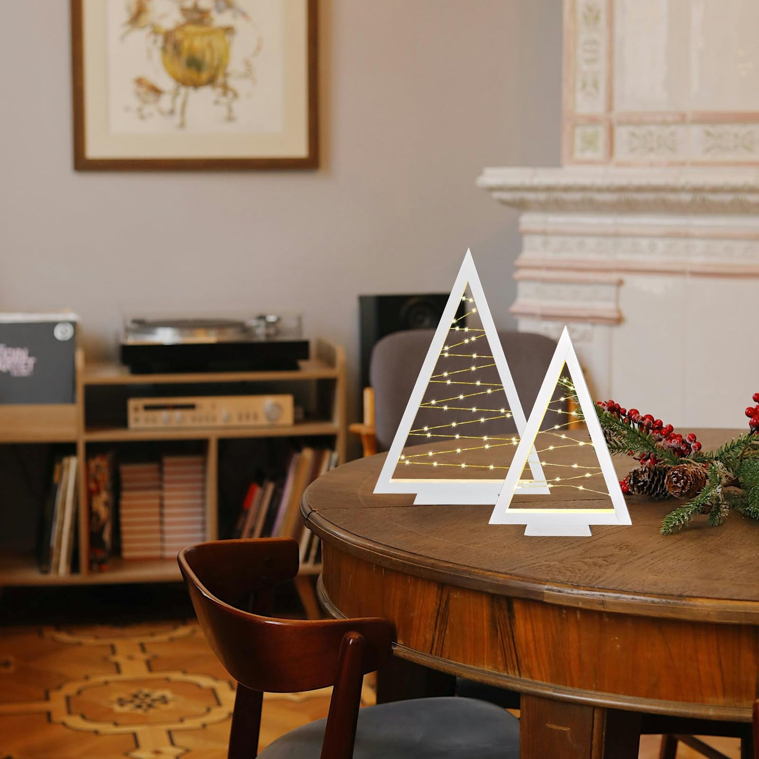 - 2 PIECES TABLE TOP CHRISTMAS TREE - Each set includes 2 pieces of Christmas LED table decorations, different heights, but all are similar to the design of a Christmas tree, warm white LED lights cover the center of the tree, warm white lights bring a festive atmosphere to your space and create sweet time with your families.