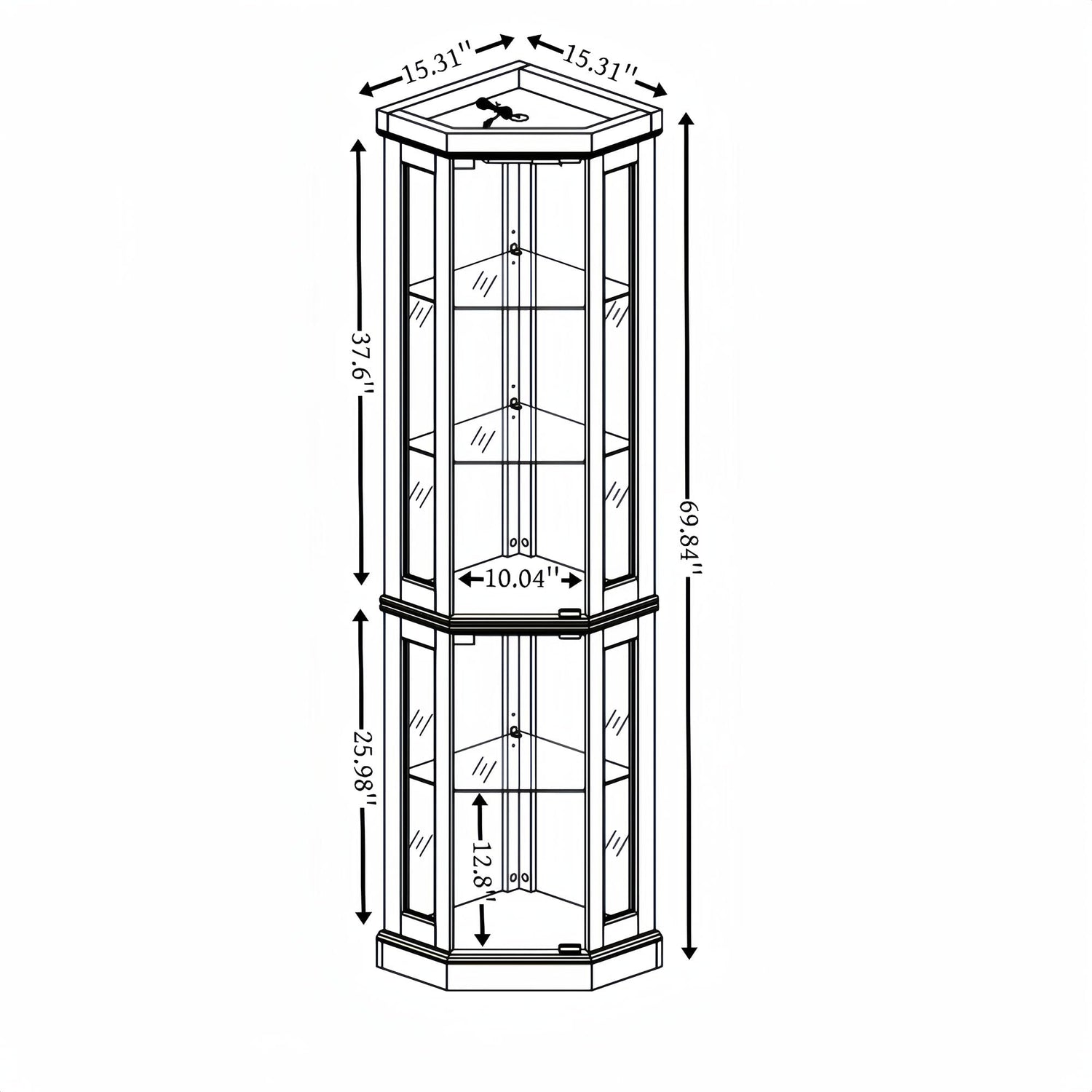 - Spacious Display: The corner lighted curio cabinet offers abundant and exquisite display space with two side-hung glass pane doors and adjustable shelves. Personalize your showcase to highlight your treasures with elegance, illuminated by the included light for a sophisticated touch.
