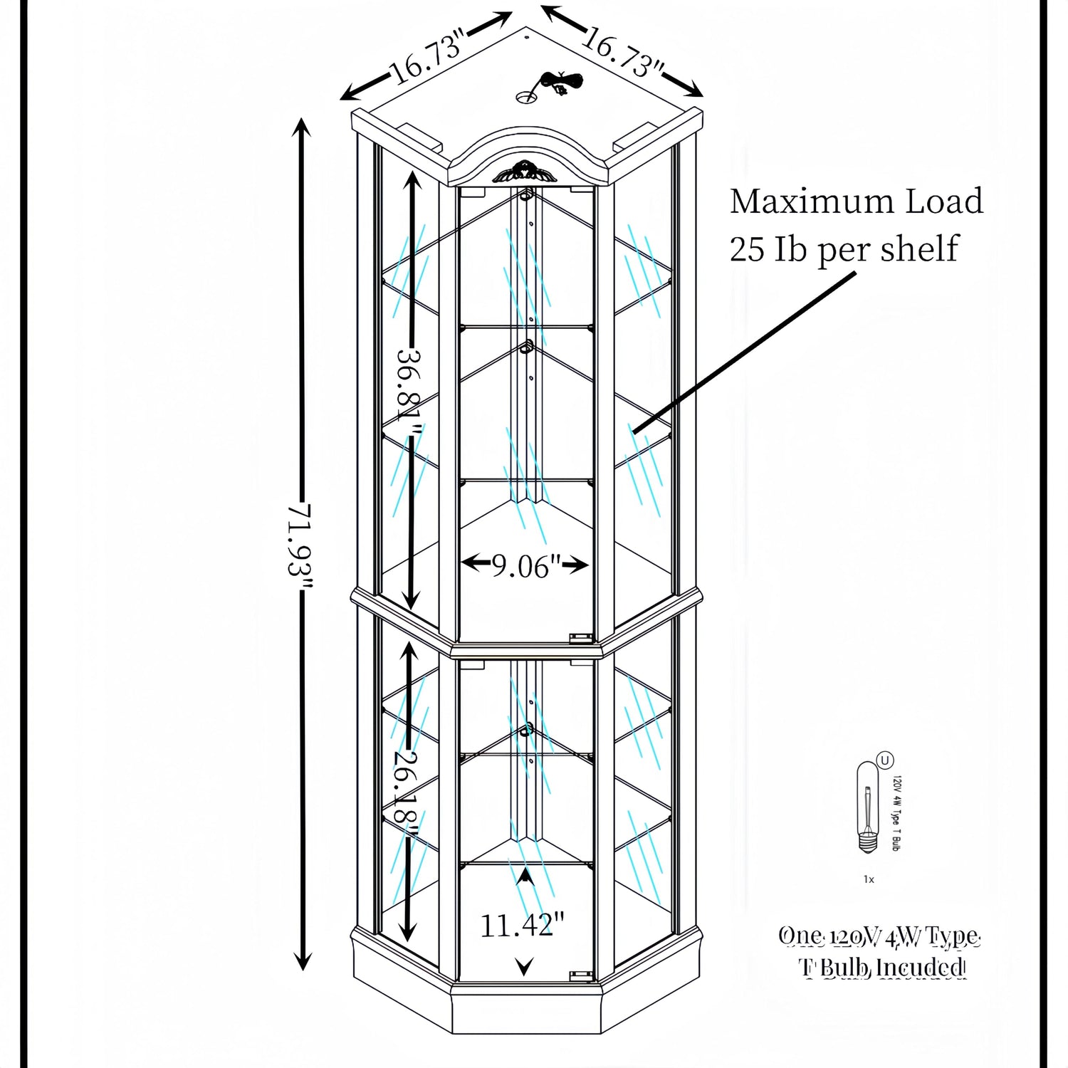 - Adjustable Shelving Versatility: The corner curio cabinet features 4 adjustable tempered glass shelves that offer versatile display options for your collectibles. The shelves can be easily repositioned to accommodate different heights of items, allowing you to create a visually stunning display. This customization capability adds a sophisticated touch to your collection, making it a perfect choice for showcasing your treasures.