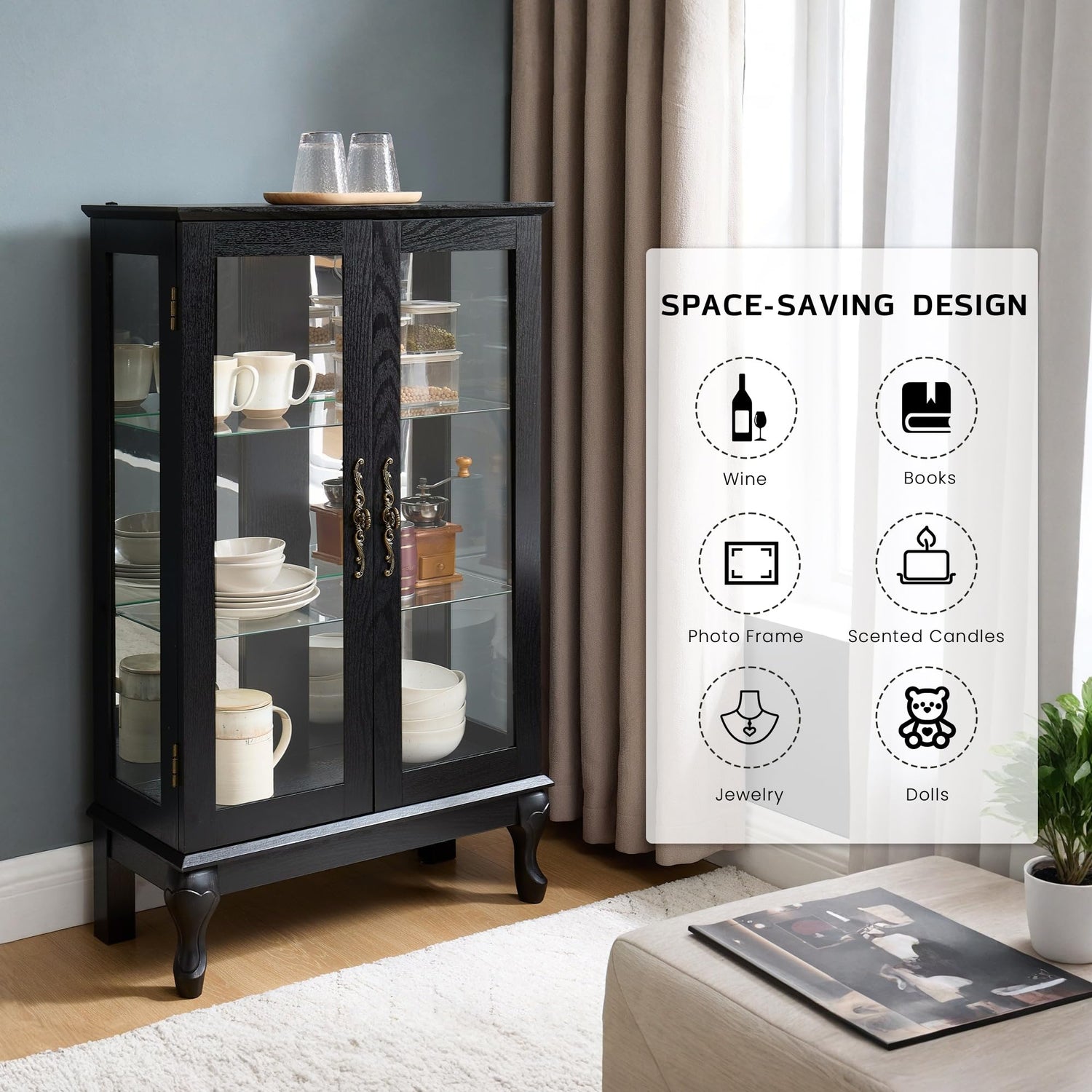 - [Spacious and Elegant Cabinet]This curio cabinet is like a stylish storage solution for your home! With 3 shelves—including one fixed wooden shelf and two adjustable tempered glass shelves (each holding 15-22 pounds)—it offers plenty of space for your books, wine bottles, or collectibles. Perfect for any room, it adds elegance and function wherever you need it.