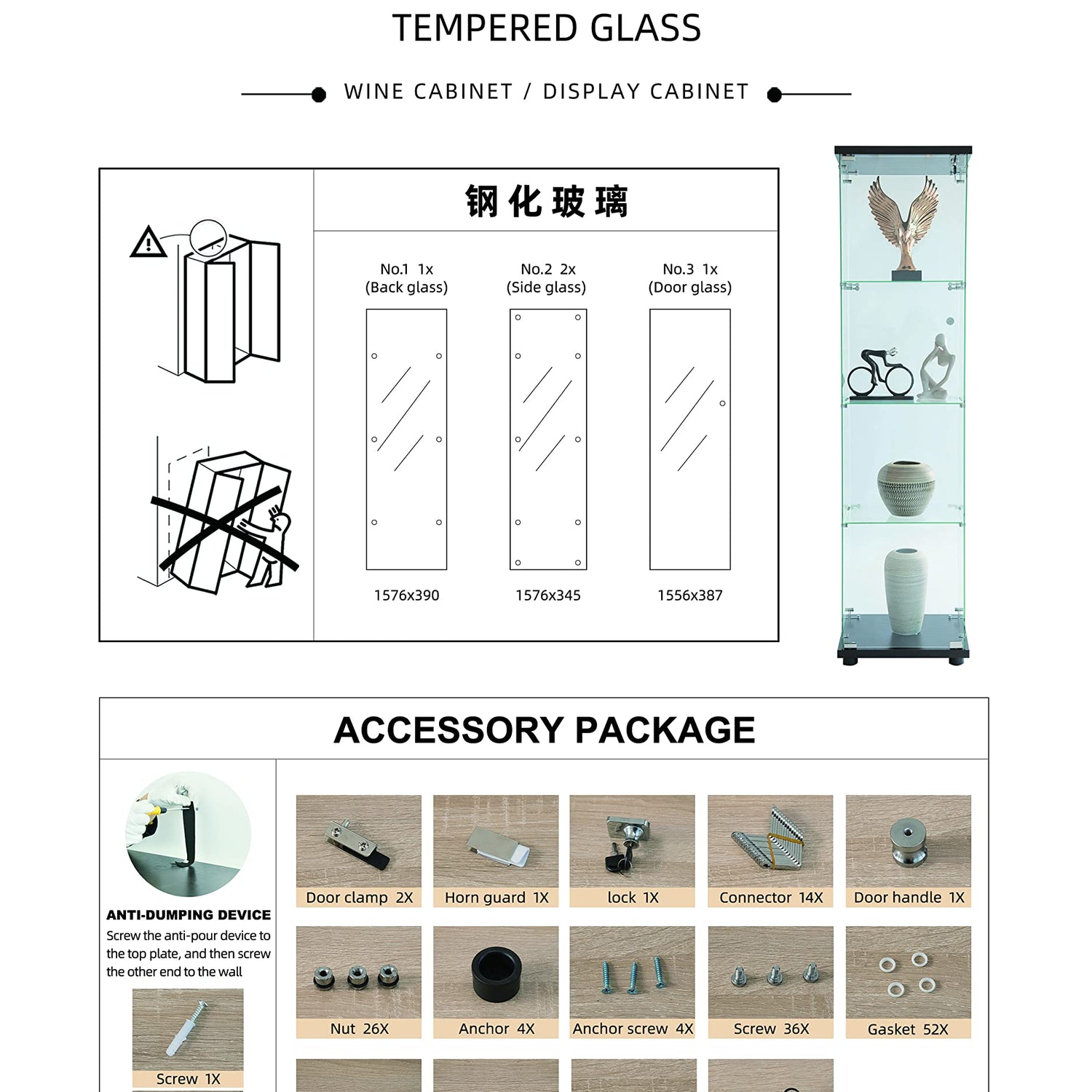 - More Safety Design:The silver handle on the cabinet facilitate your switch.The lock design can protect your collections from accident losting.anti-dumping device make the cabinet more stable than former version,it can efficiently prevent tipping over of your favorite collections.There are bumper strips between glass plates and sides for maximum safety.This glass cabinet is durable and practical for everyday use.If the display case you recieved is broken,don't worry,just contact us.