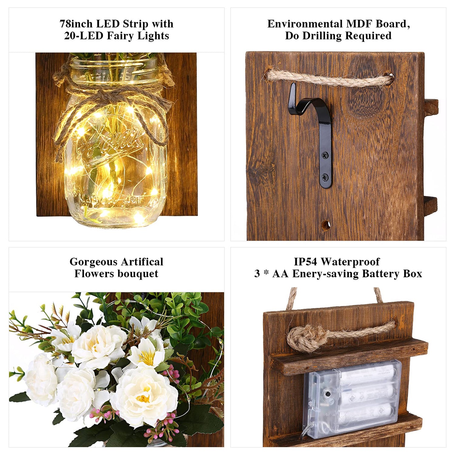 - 【Change Favorite Flowers According to The Season】 Our rustic decor wall hanging gives you enough DIY space, you can change your favorite flowers according to the season and mood, so that your home decor light can say goodbye to being single and unchanging. Besides, this flower mason jars light only takes a few minutes to install, perfect for enjoying the joy of handmade diy with your loved ones and kids.
