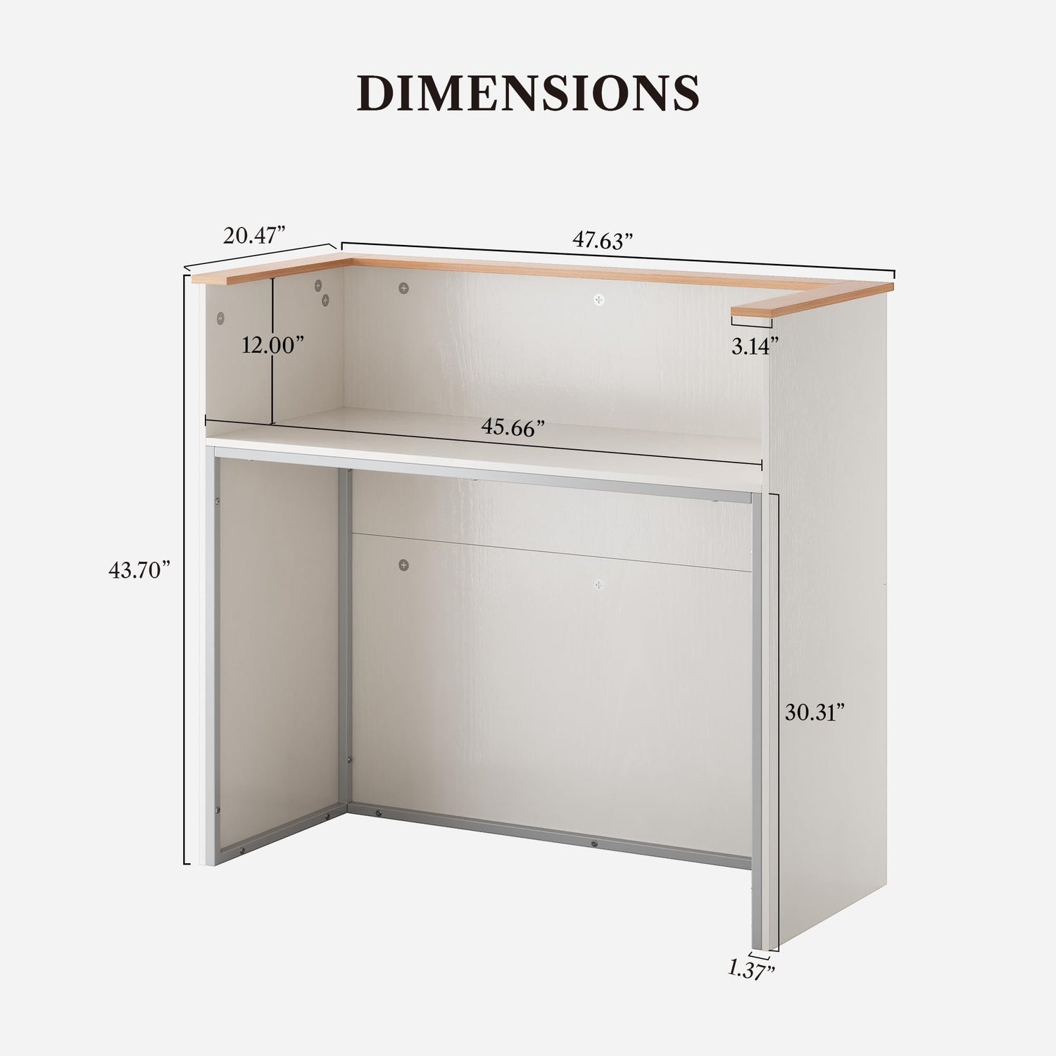 - AMPLE WORKSPACE: 47.63” W *20.5” D large desktop offering excellent room for your computer, files, papers, or decorations to keep your work essentials organized. The 43.7" tall perfect size allows guests to stand comfortably while the upper shelf provides a convenient writing surface or an extra spot for a cash register. Wraparound side panels create a more private area so you can focus on the task at hand