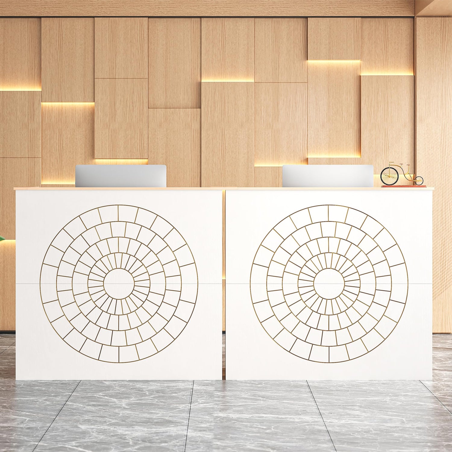 - MODERN RECEPTION DESK: A class black-looking accent with unique golden lines gives this receptionist desk a modern and chic look that is sure to make an impression. Start your workday stylish and professionally at our counter desk. In order to ensure the integrity of the design, our reception desk has no cable grommet