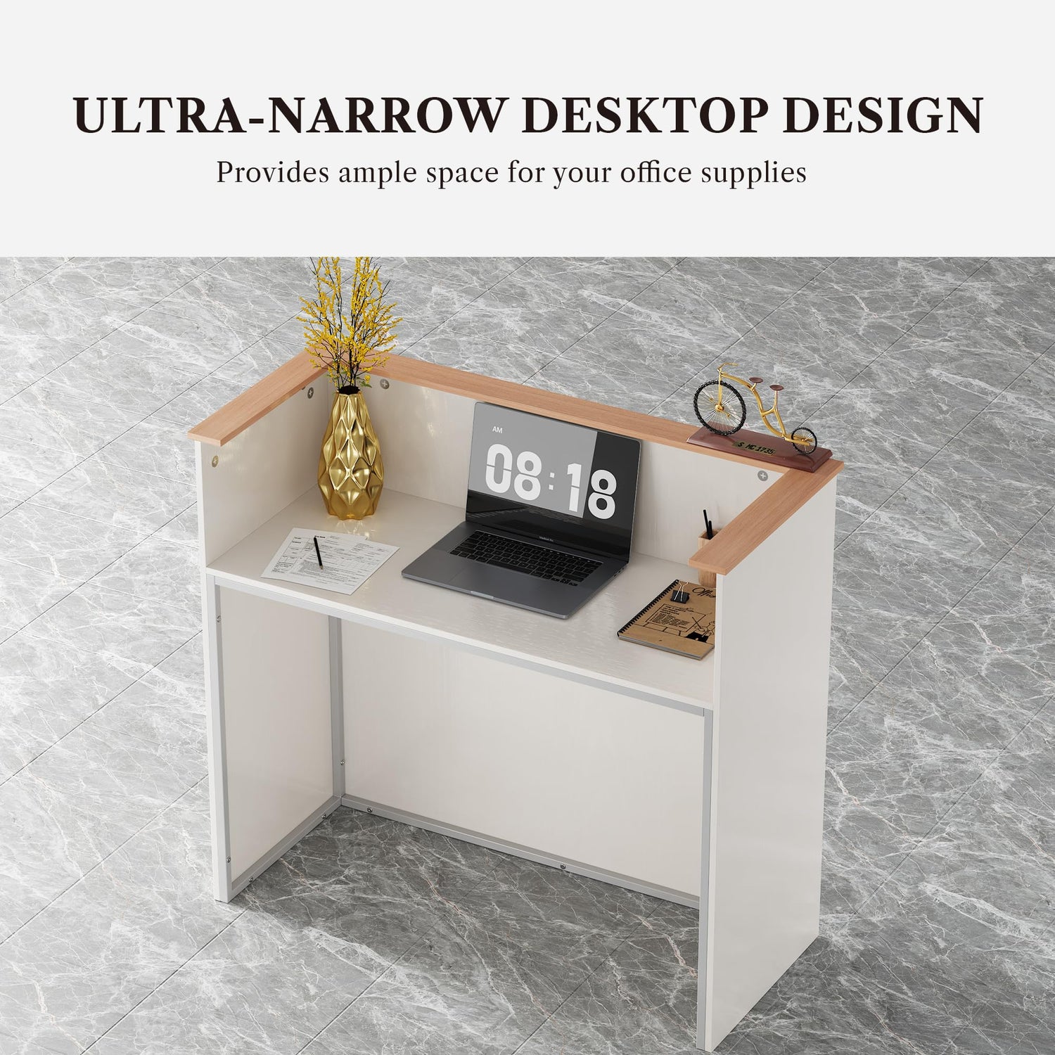 - SOLID CONSTRUCTION: Made of high-quality thickened MDF and sturdy steel frame to ensure excellent durability and great sturdiness, this small reception desk is built to last, wear and scratch resistant, with a weight capacity of up to 220 lbs. Moreover, grommet holes for cord management keep messy cords organized. Four adjustable feet greatly improve stability