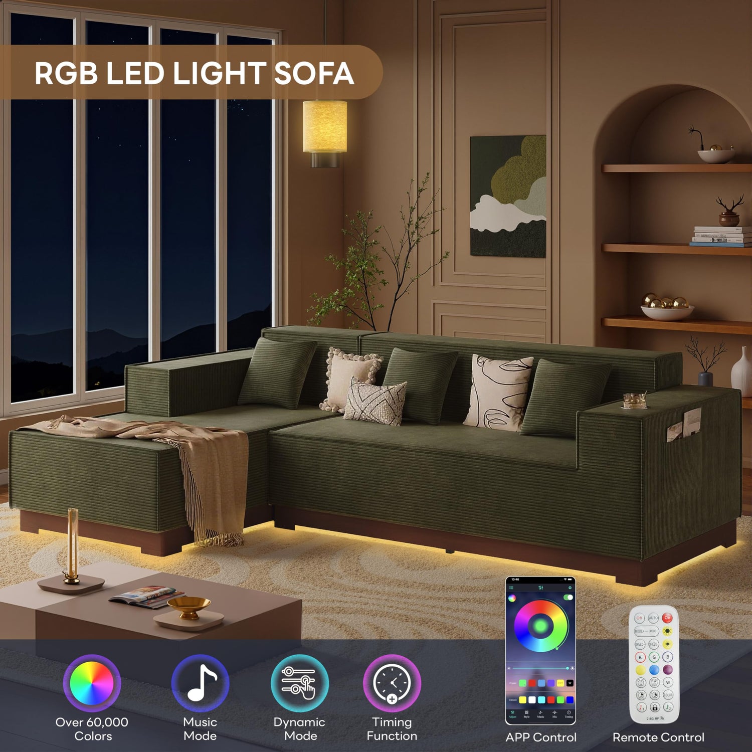 - Smart RGB LED Lights: Enhance your ambiance with smart LED lights installed under your sofa. Control them effortlessly via REMOTE or mobile APP with over 60,000 colors to choose from. Explore various modes including Style Mode, Music Mode, Microphone Mode, and Timer Function to create your own unique light shows.