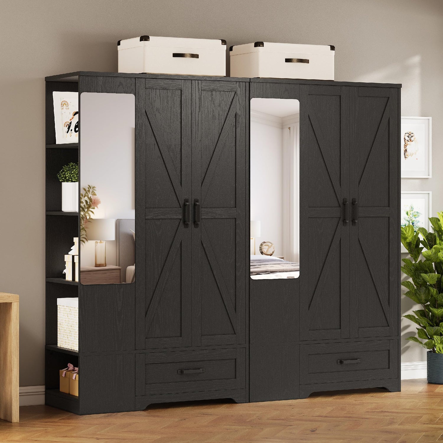 LIKIMIO Armoire Wardrobe Closet 70 Inches, Large Storage with Mirror, 2 Doors, Drawer, and Shelves, Modern Bedroom Freestanding Wooden Wardrobe Combination with Hanging Rail, Black