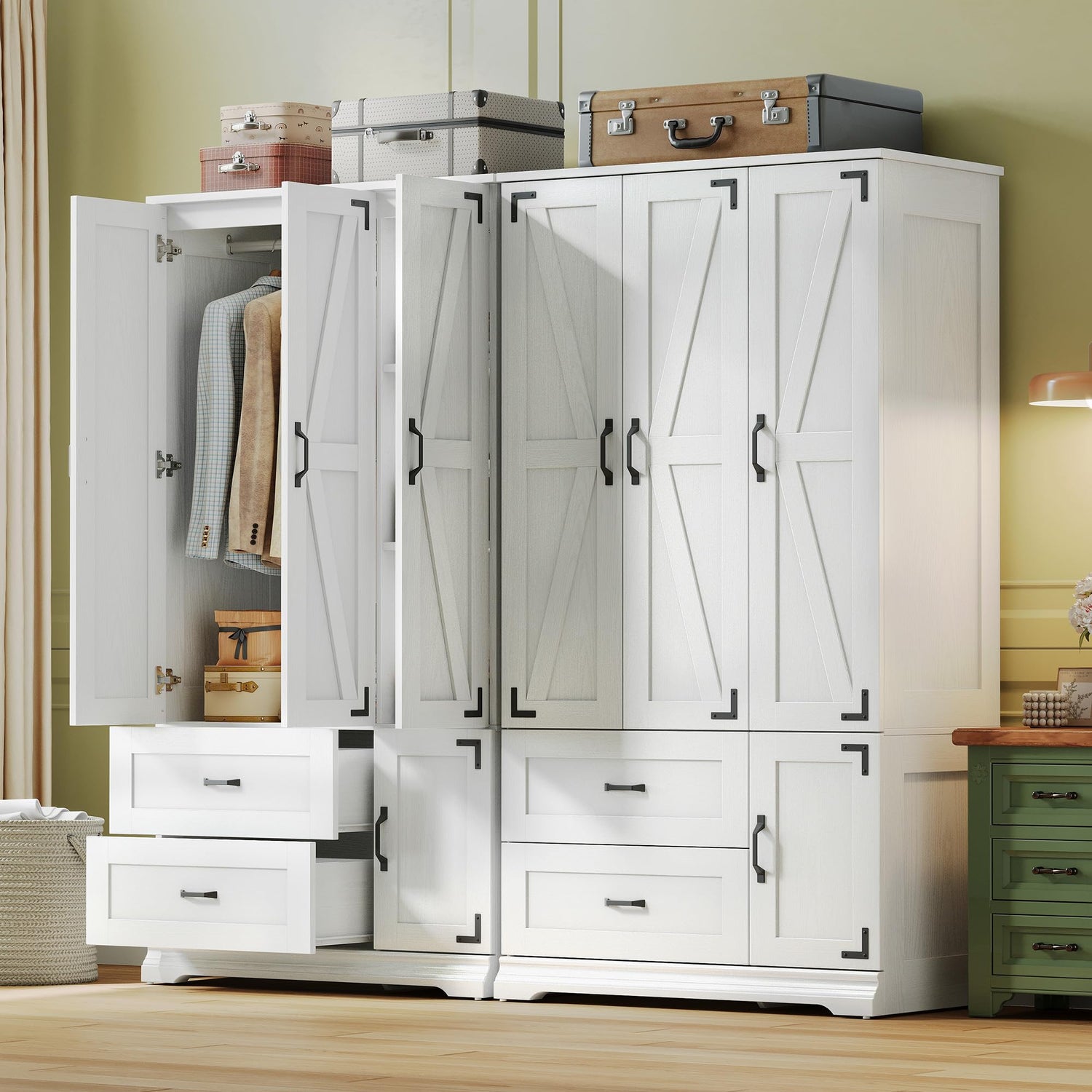 LIKIMIO Armoire Wardrobe Closet 71" H, Bedroom Wooden Wardrobe with 4 Doors and 2 Drawers, Farmhouse Clothing Storage Cabinet Combination with Hanging Rod, Shelves, and Hooks, White