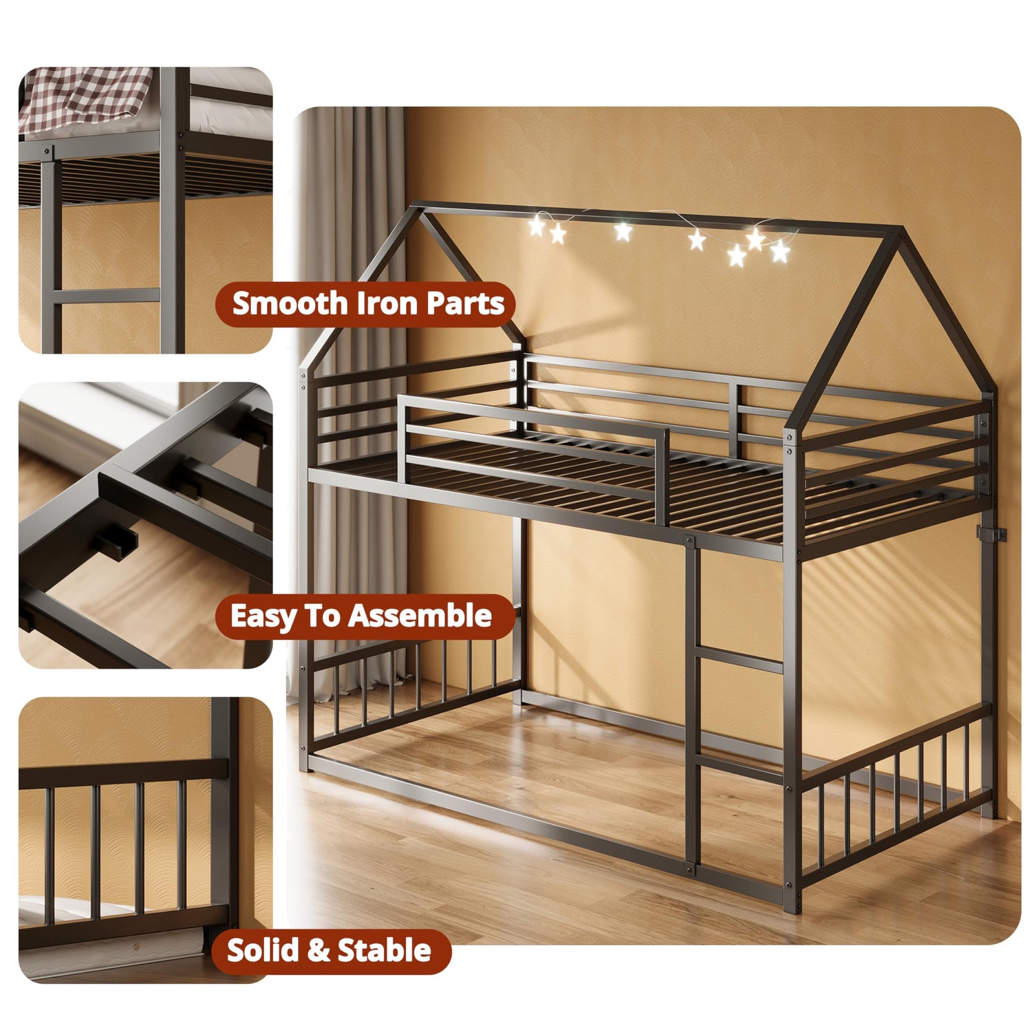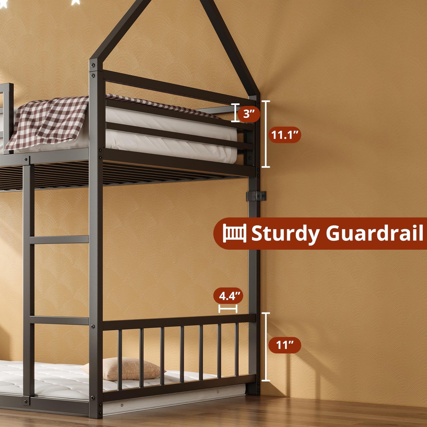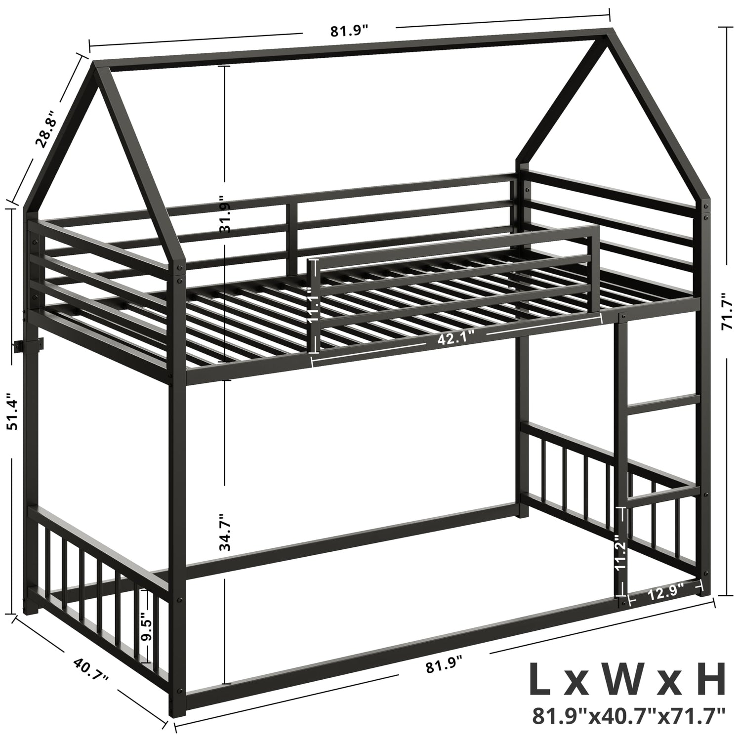 LIKIMIO Bunk Bed Twin XL Over Twin XL, Metal Bunk Bed Frame with Ladder and Guardrail, House Shaped with Metal Slats for Dormitory and Bedroom, Space Saving, No Box Spring Needed, Black