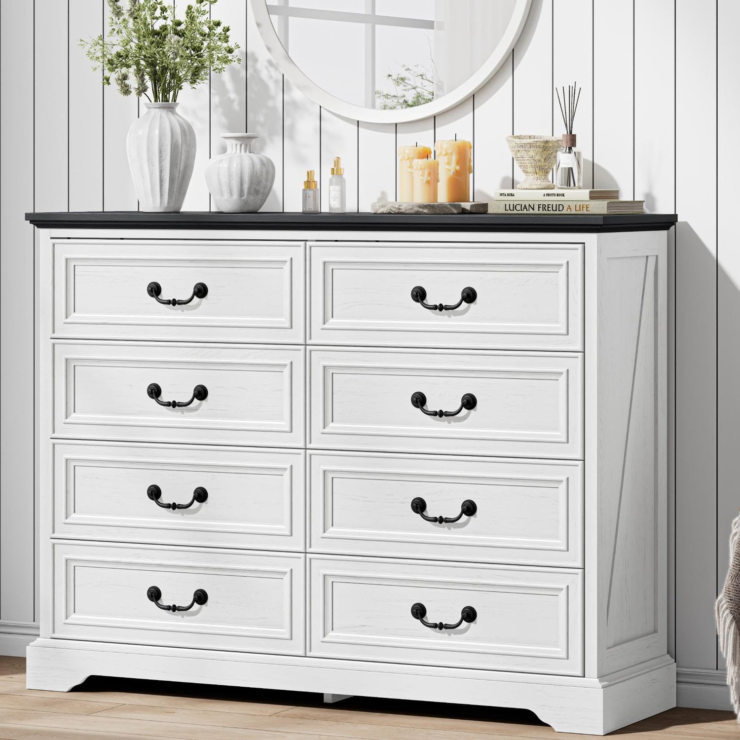 LIKIMIO Farmhouse 8 Drawer Dresser for Bedroom, 52" Wide Dresser Drawers with Storage, Rustic Wooden Chest of Drawers for Bedroom, Hallway, Antique White