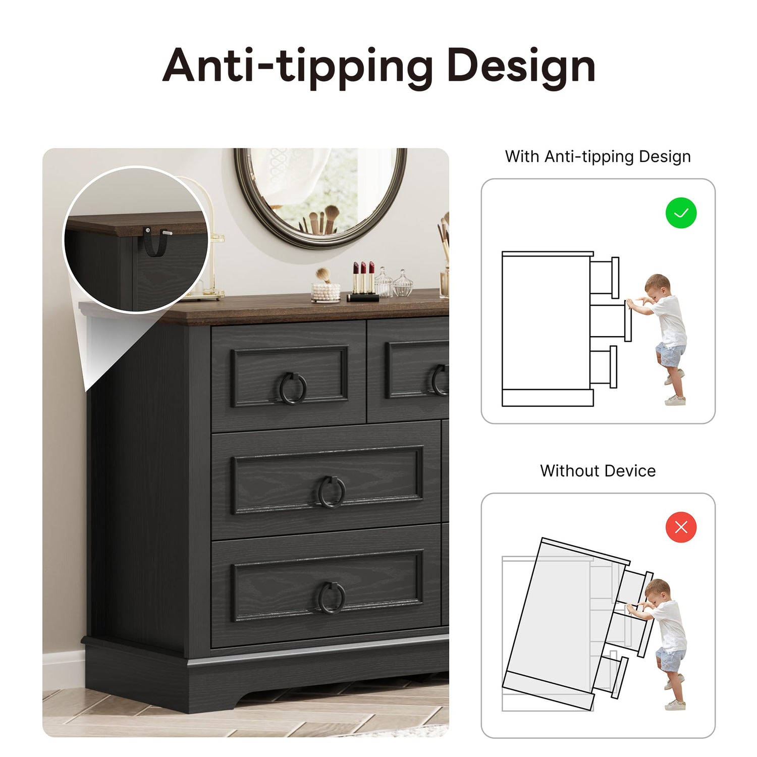 - Quality Assured: Constructed from premium materials, this bedroom dressers with drawers is wear-resistant and water-resistant. It features a thickened tabletop and raised legs for added stability. An included anti-tip device offers extra safety