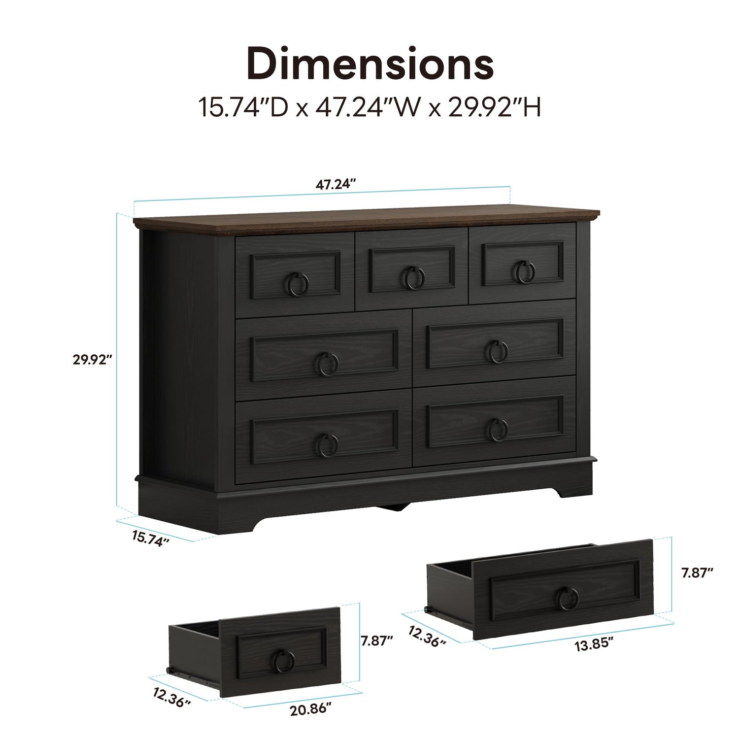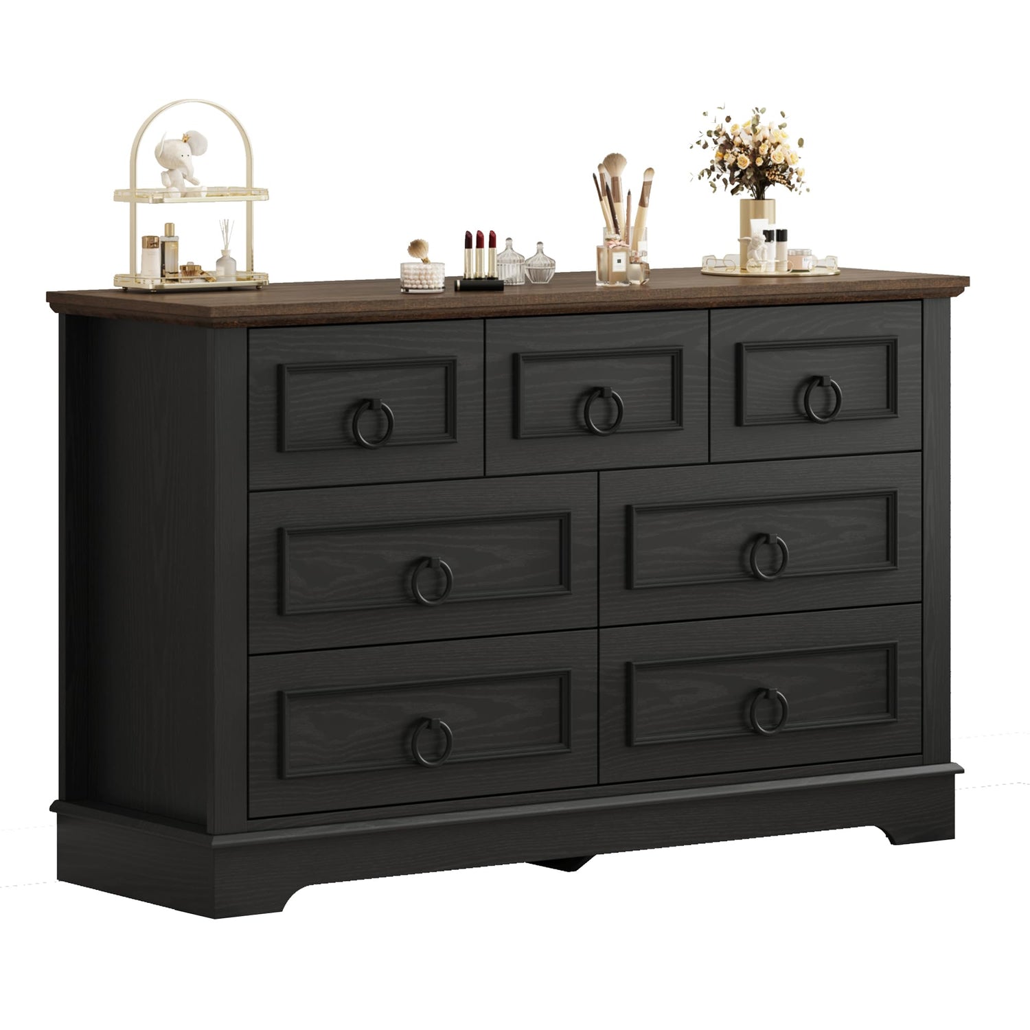 LIKIMIO Farmhouse Dresser for Bedroom with 7 Drawer, 47.2" Wide Wood Rustic Chest of Drawers with Round Metal Handle, Thickened Desktop, Storage Dressers for Bedroom, Hallway, Entryway, Black
