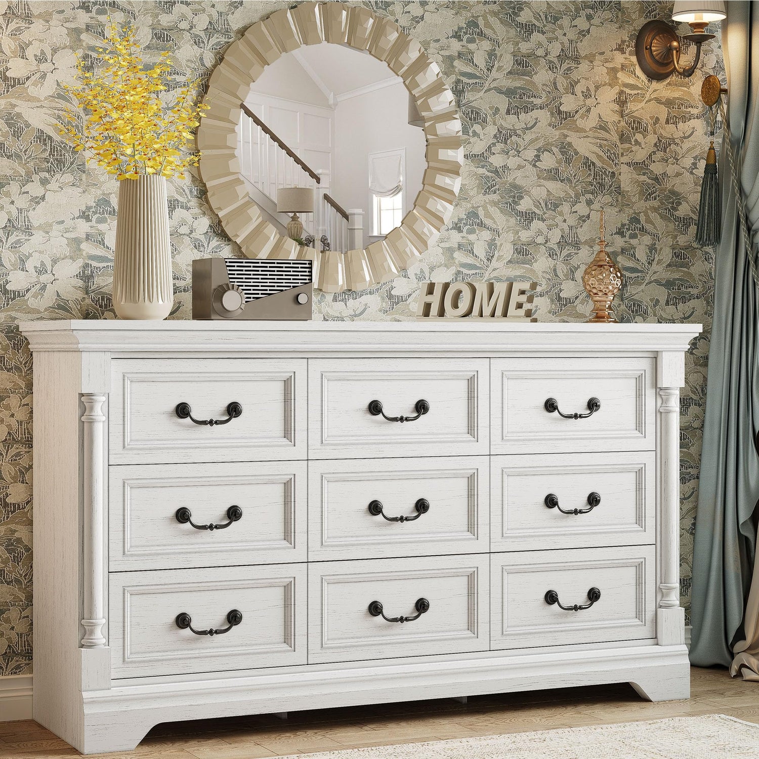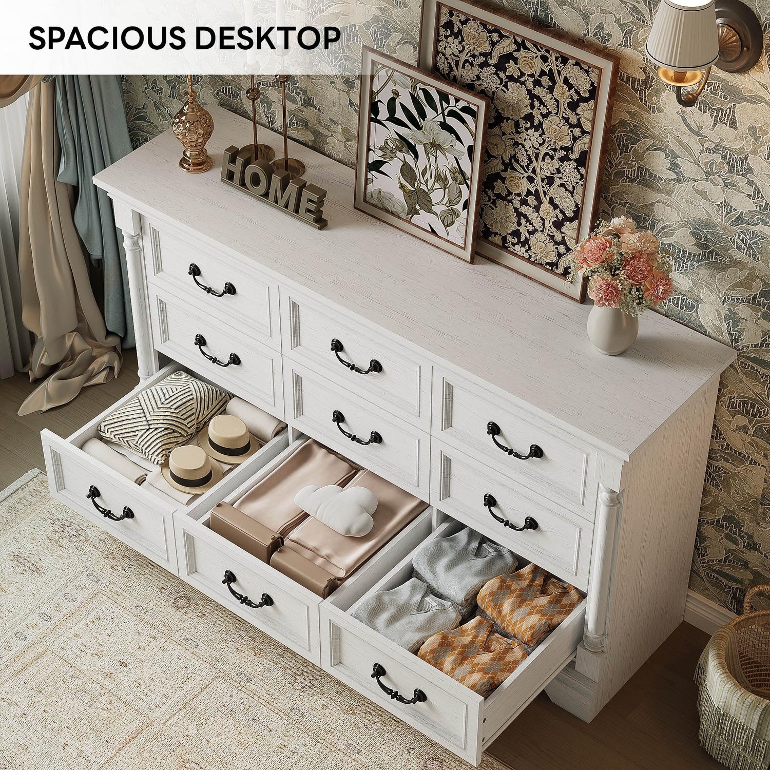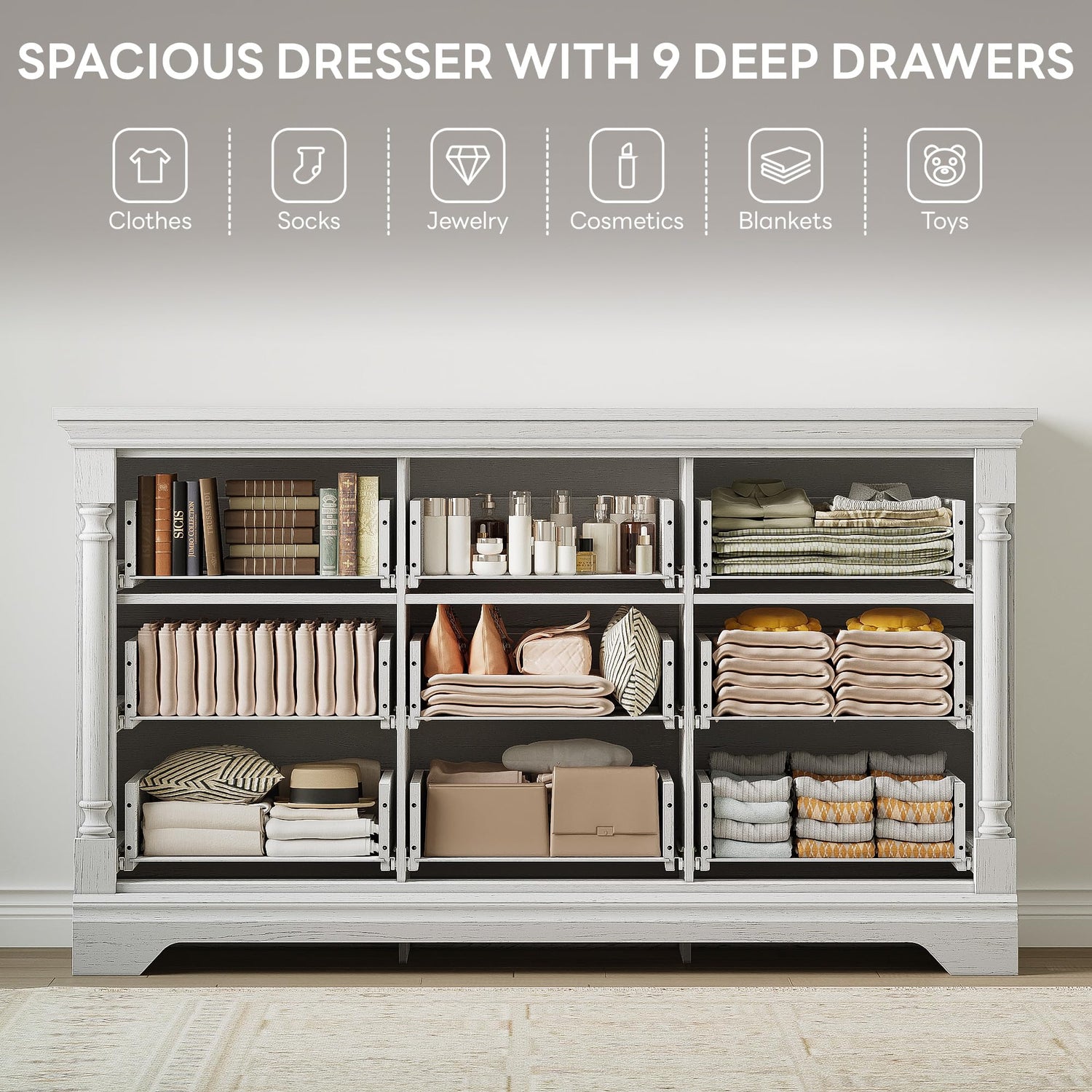 LIKIMIO Farmhouse Dresser for Bedroom with 9 Drawers, 58" Wide Wood Chest of Drawers with Roman Column, Dresser TV Stand for 65", Closet Storage Dressers Organizer for Bedroom, Living Room, Hallway