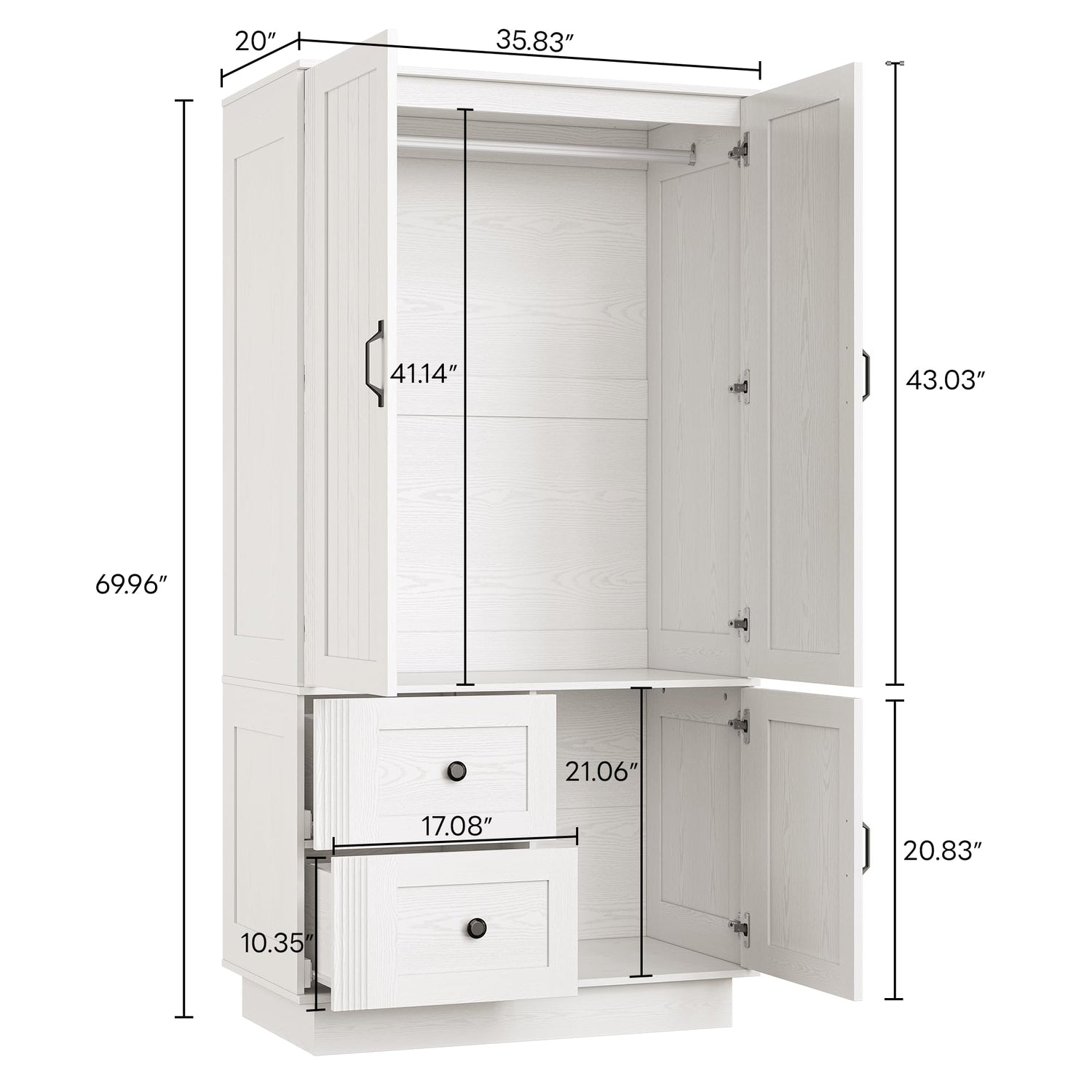 - Spacious Wardrobe Storage:Designed to maximize your organization, this armoire wardrobe closet includes a full-length hanging rod behind the double doors for dresses, coats, or suits. 2 drawers and 1 lower closet cabinet offer extra room for folded clothes and accessories.