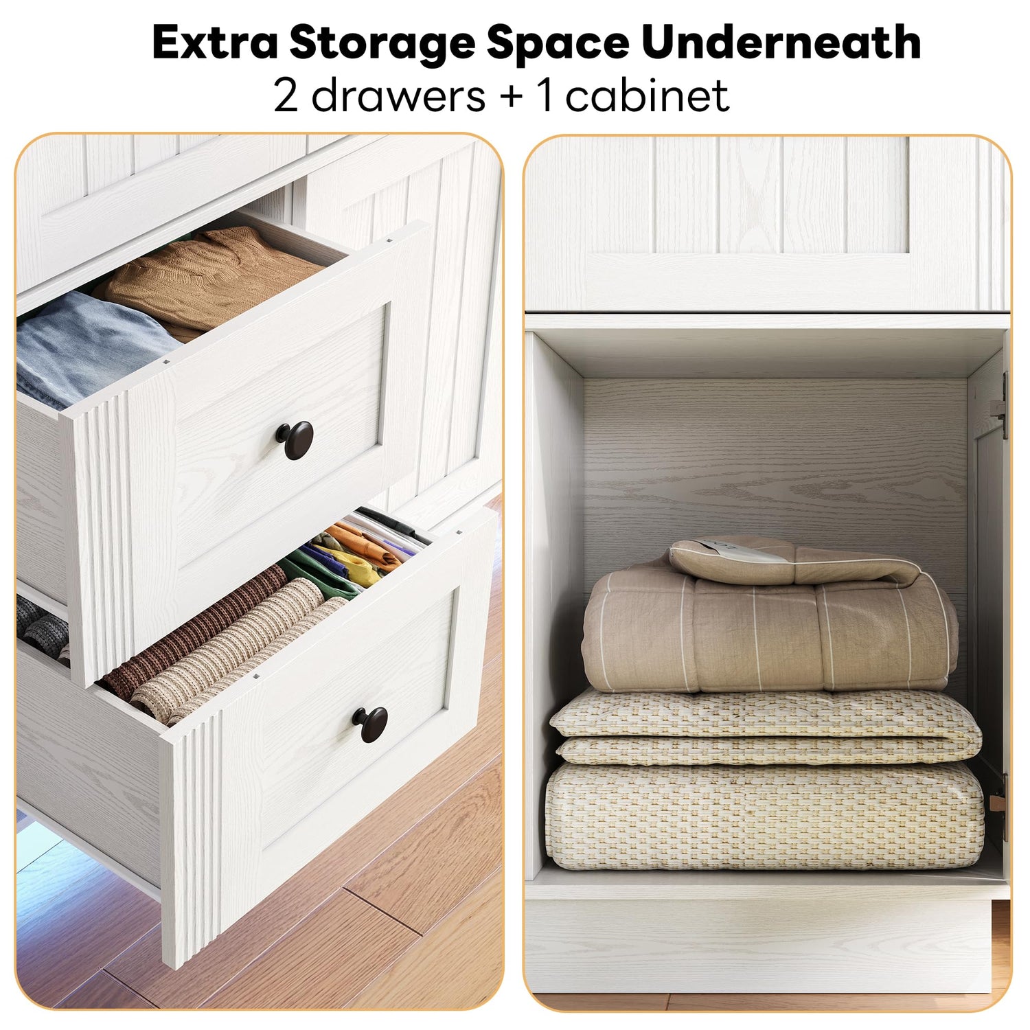 - Stylish Farmhouse Design:Crafted with vertical slatted panels, clean lines, and classic molding, it blends rustic elegance with modern utility. The matte black metal handles add a bold contrast to the white wood finish, making this wardrobe closet a statement piece in any space.