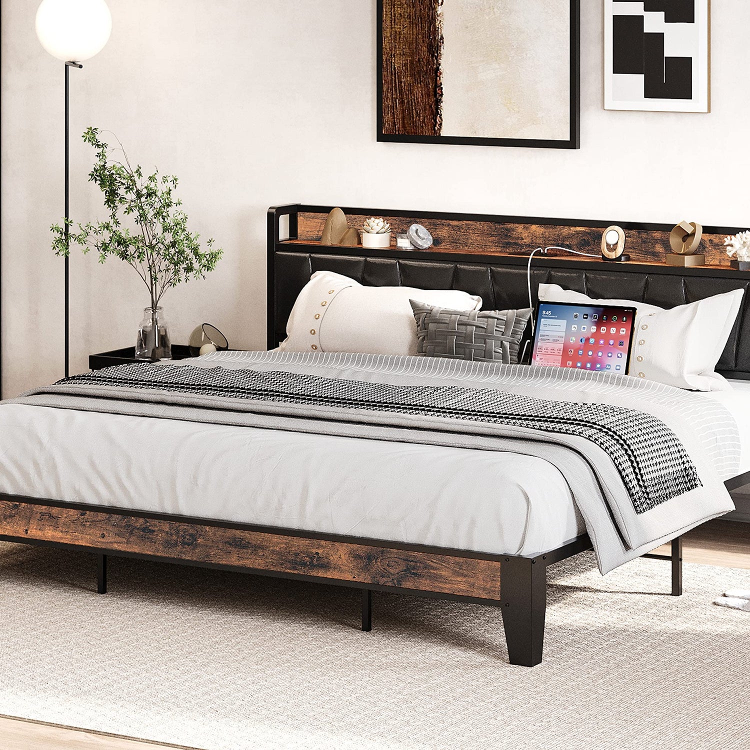 LIKIMIO Vintage Brown King Bed Frame with Storage Headboard and Charging Station