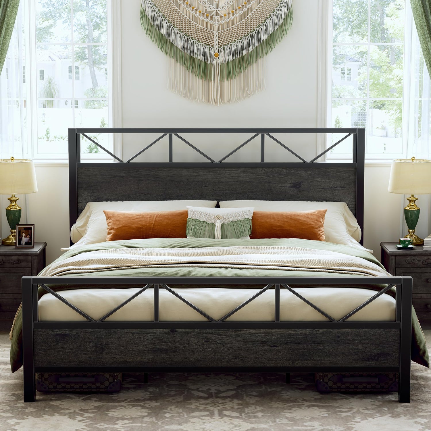 - Industrial Style: P2 graide MDF board and black metal.Charcoal grey industrial appearance and reliable steel frame, both retro and modern aesthetics, are very suitable for your bedroom