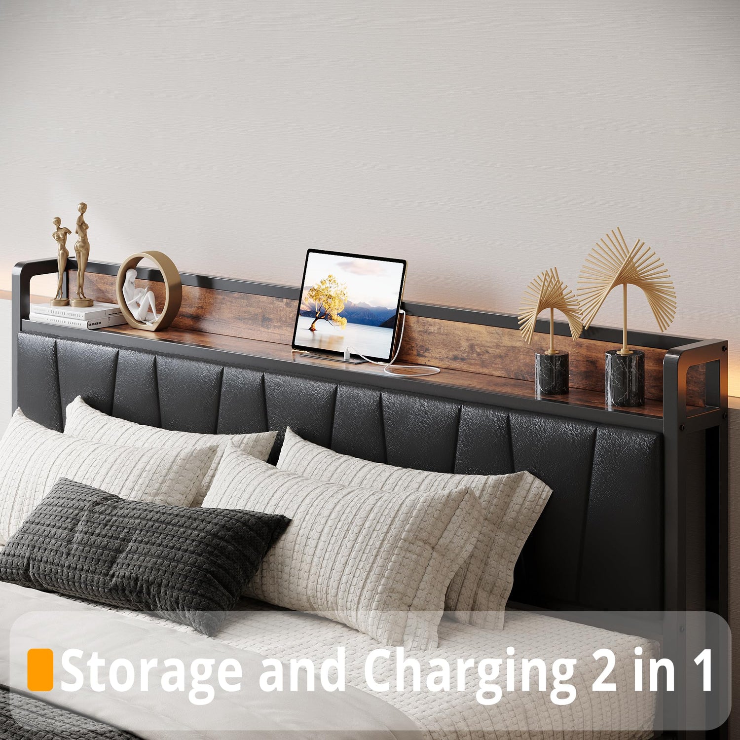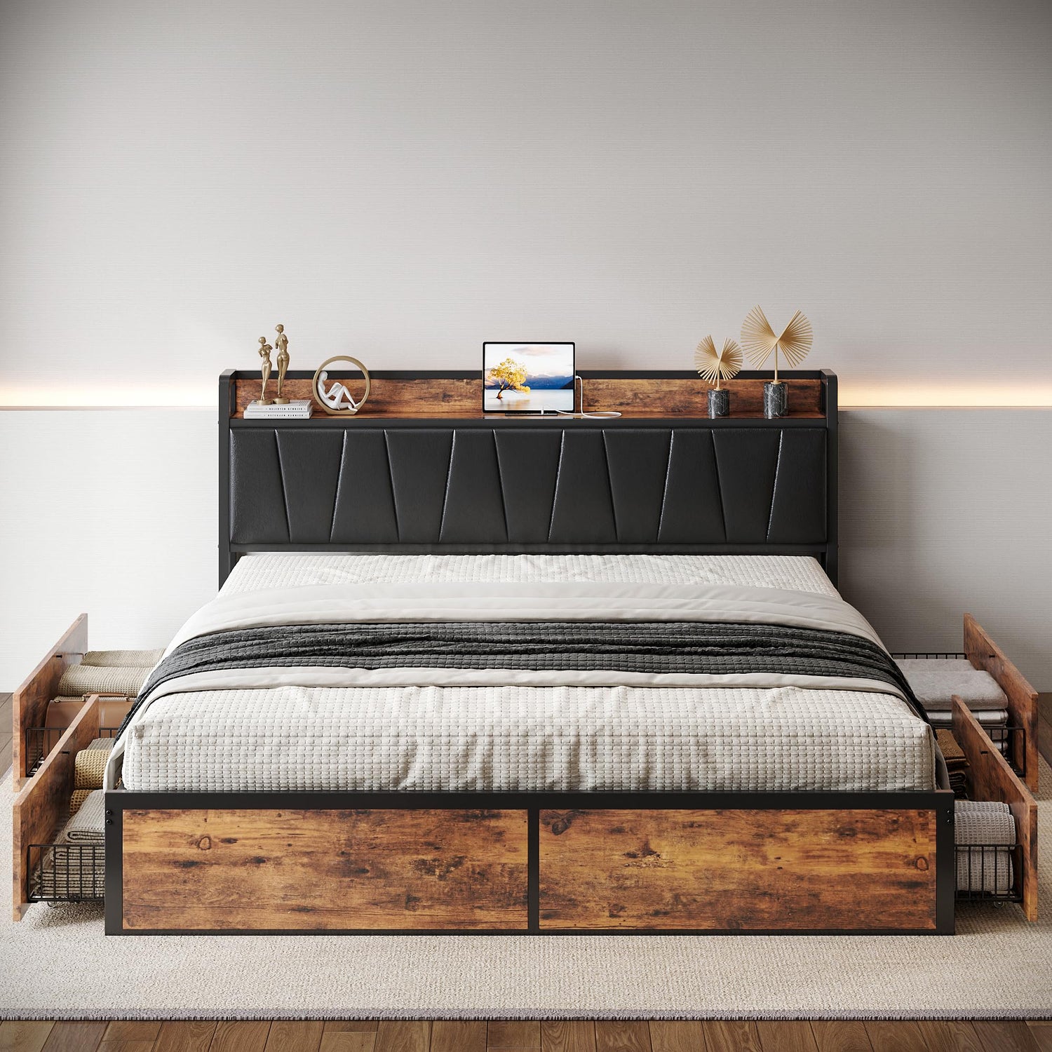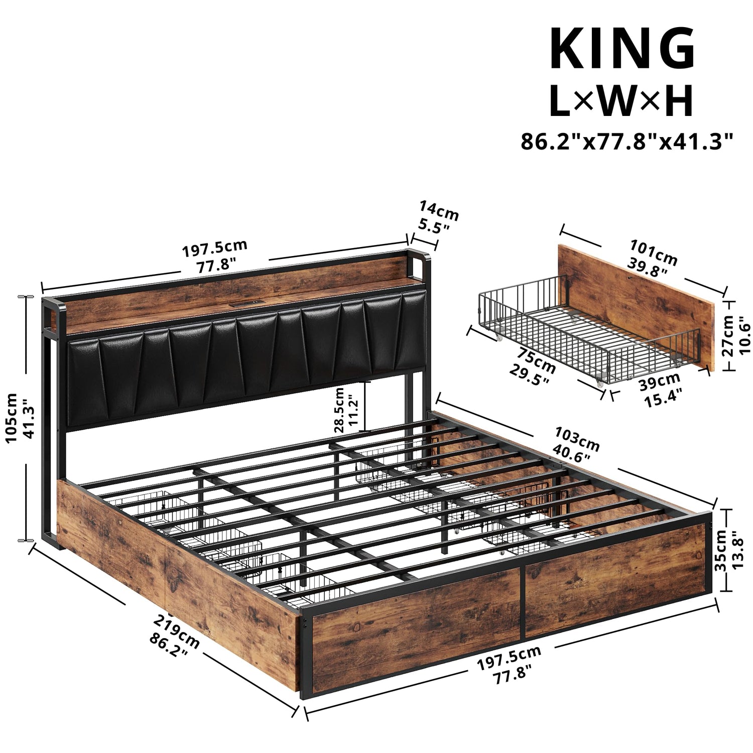 LIKIMIO King Bed Frame with 4 Storage Drawers, Platform Bed with Charged Headboard, Sturdy and Stable, No Noise, No Box Spring Needed, Easy to Install, Vintage Brown and Black