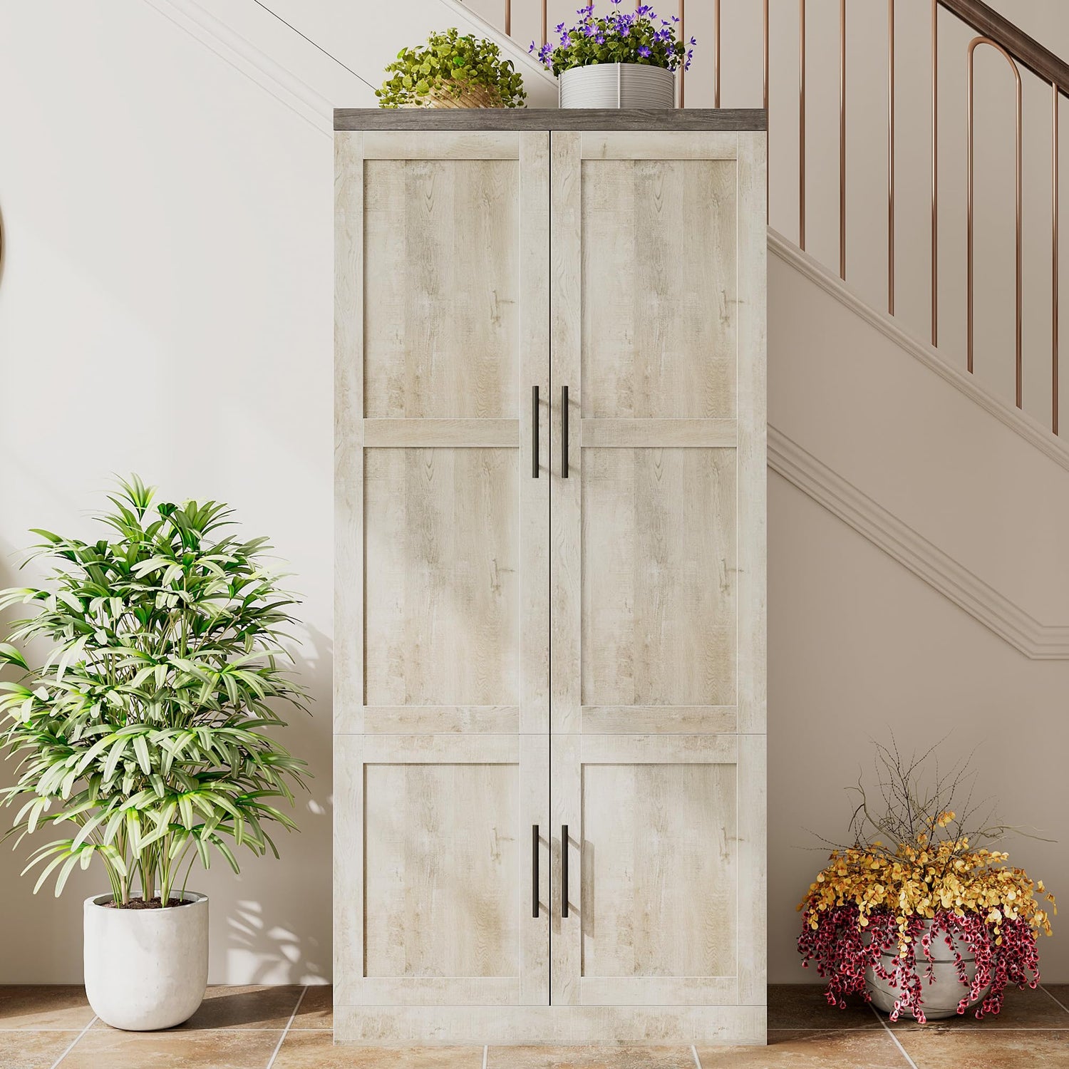 LIKIMIO Large Wardrobe Closet, Farmhouse Clothing Storage Cabinet with Hanging Rod and 2 Doors, Wooden Tall Bedroom Armoires with Storage Shelves, Rustic White
