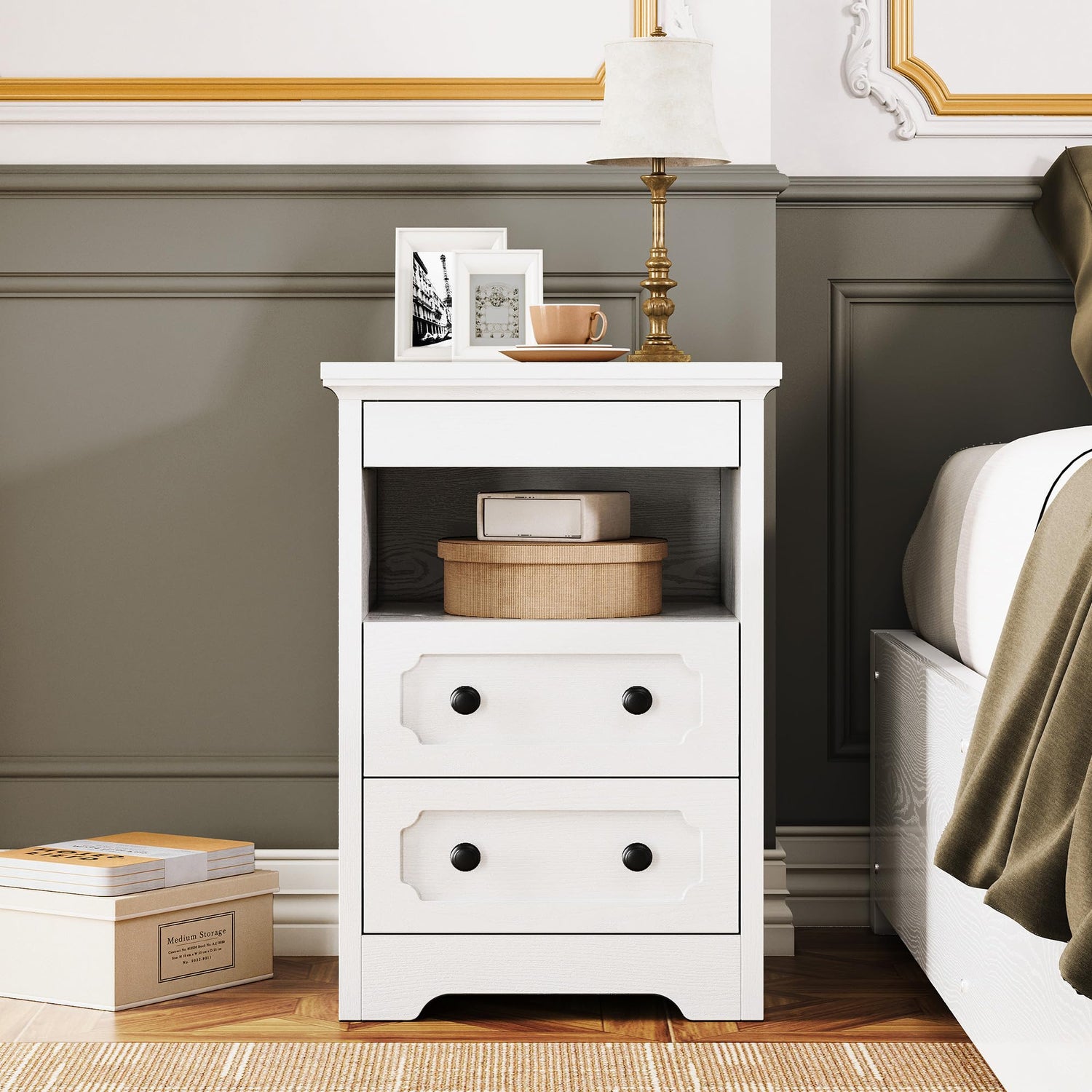 LIKIMIO Night Stand, Modern Bedside Table with 3 Drawers, Open Shelf, End Table with Pull-Out Tray, Wood SideTable, White
