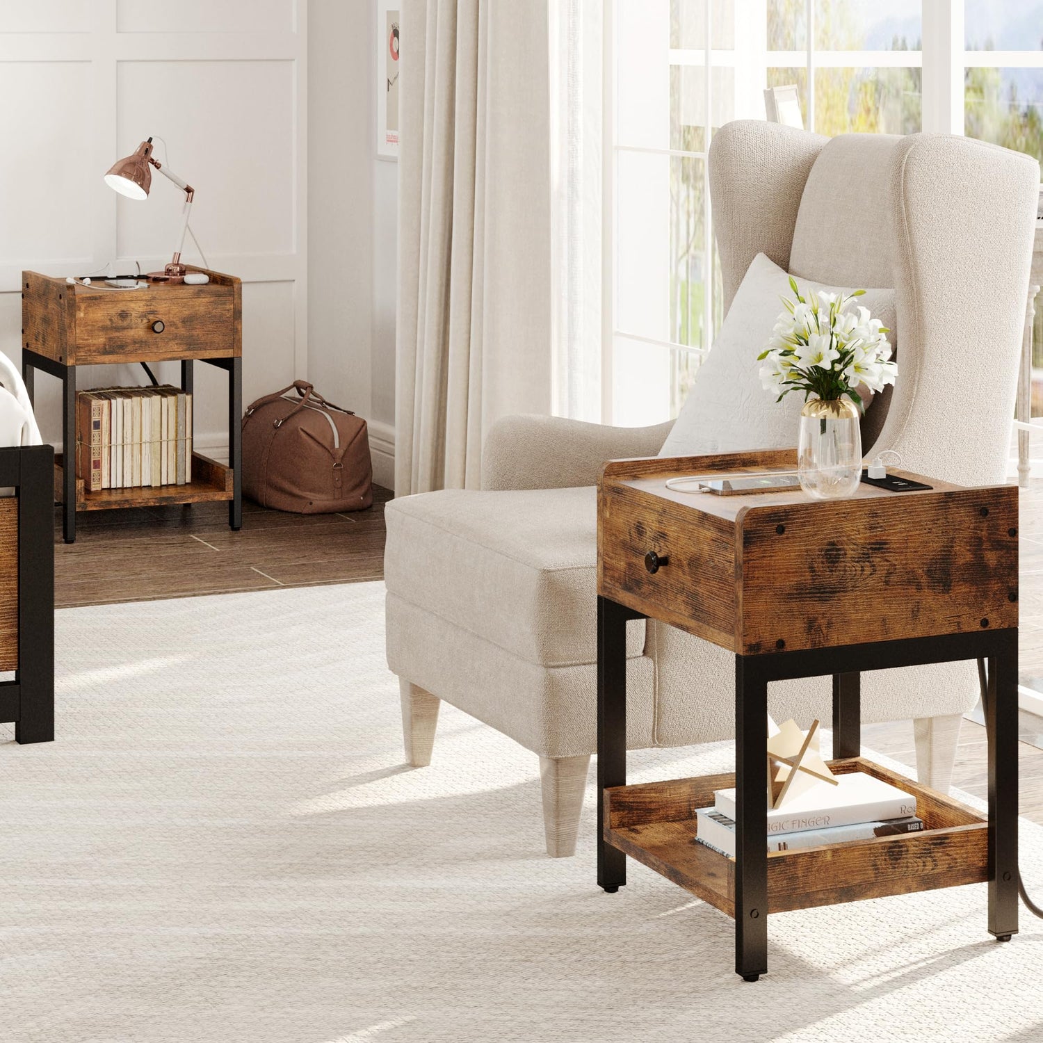 LIKIMIO Nightstand, Set of 2 Bedside Table with Charging Station, Small End Table with Storage Drawer and Shelf for Bedroom and Living Room, Easy Assembly, Stable and Sturdy, Vintage Brown