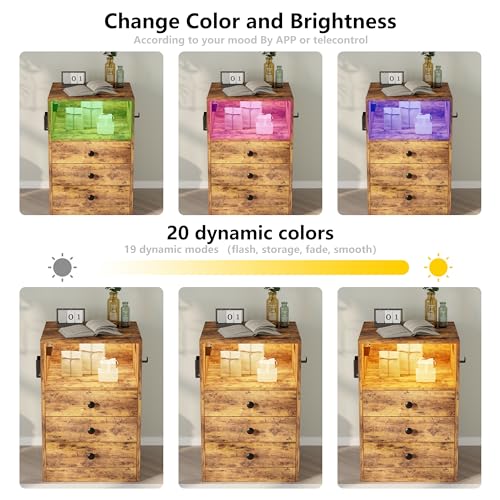 LIKIMIO Nightstand with Charging Station and 3 Drawers, LED Lights End Side Table with Interchangeable sockets and Hooks, Vintage Brown