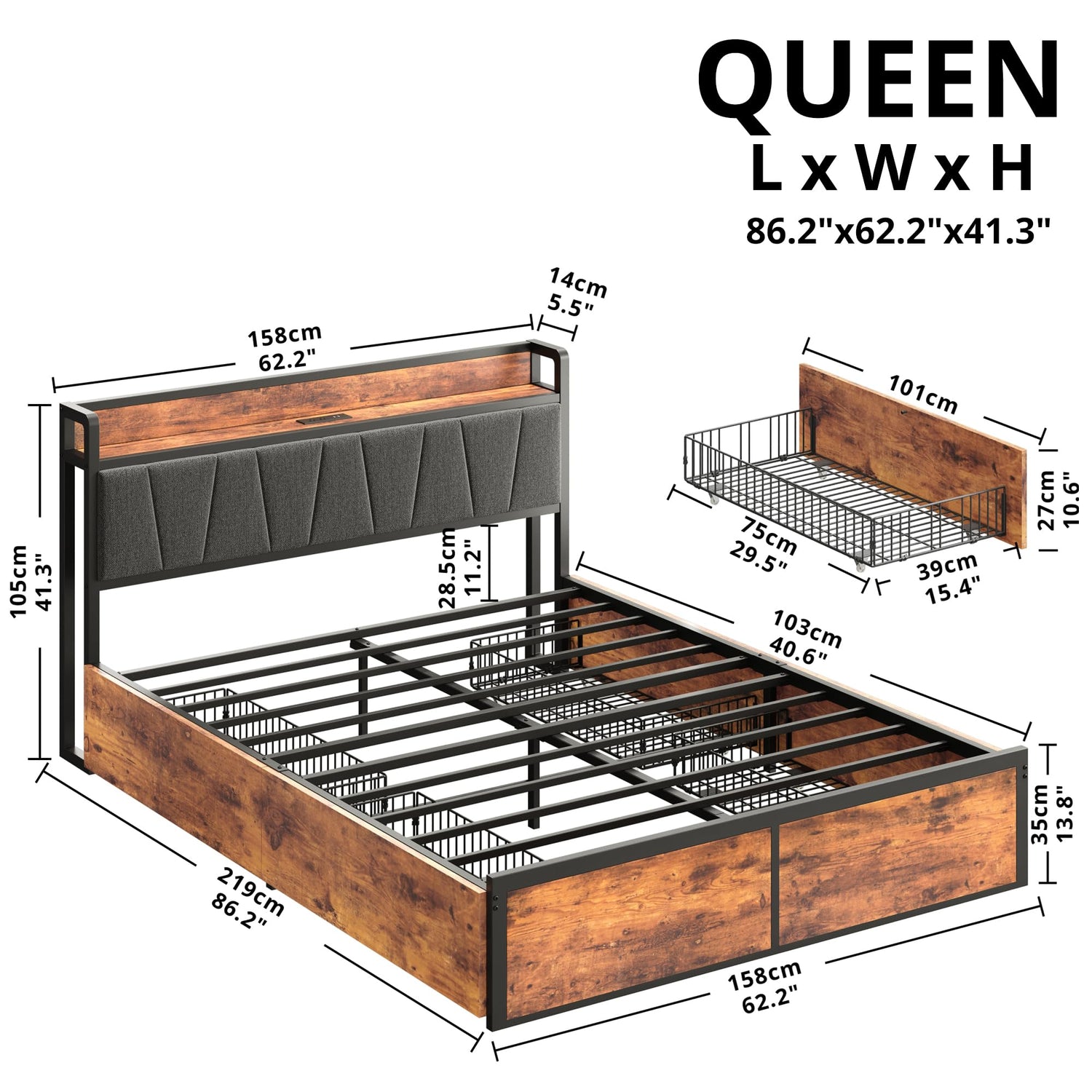 LIKIMIO Vintage Brown Queen Bed Frame with 4 Storage Drawers and Charging Headboard
