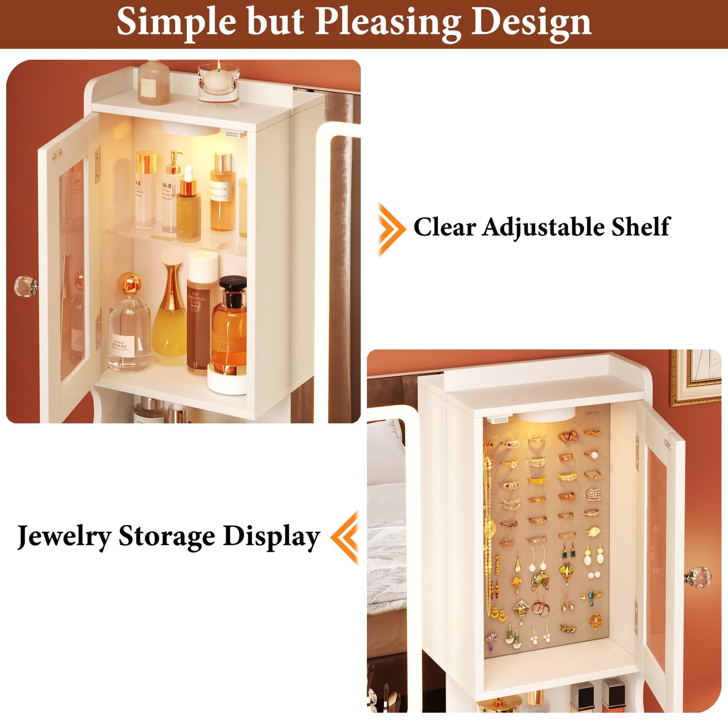 - RGB Ambience Vanity with Lights: Equipped with RGB lighting system, under the vanity desk tabletop and transparent cabinet doors, which can adjust the lighting color or brightness according to different scenes by pressing the button. With clear adjustable shelves, cabinets offers a transparent aesthetic.