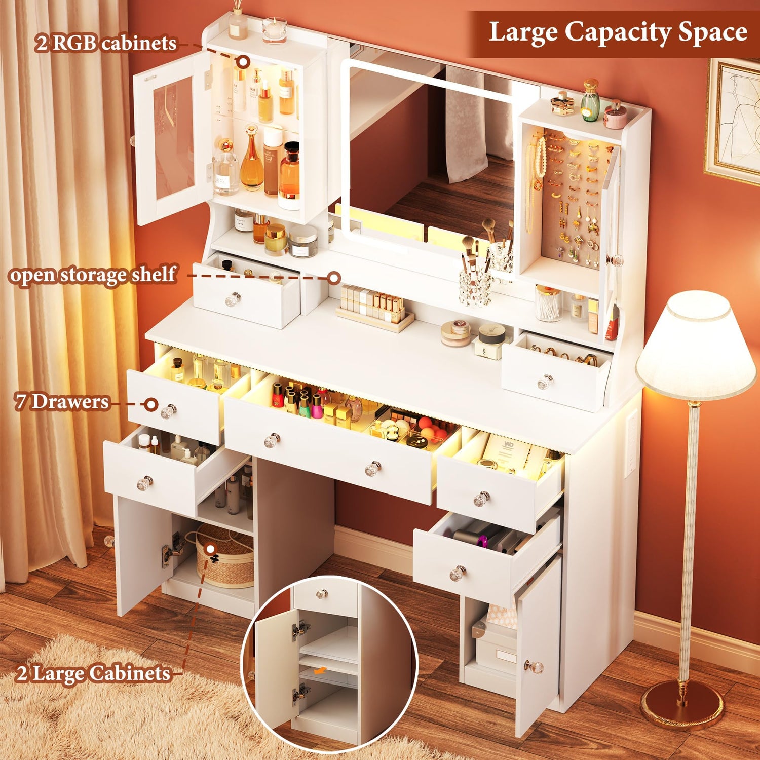 - Powerful Storage Capacity Makeup Vanity: 7 drawers of different sizes, 1 open storage shelf, 2 RGB cabinets and 2 storage cabinets can hold all your ornaments, skin care products, and other items. Space on the top of the RGB cabinet to place decorations for your own vanity desk design.