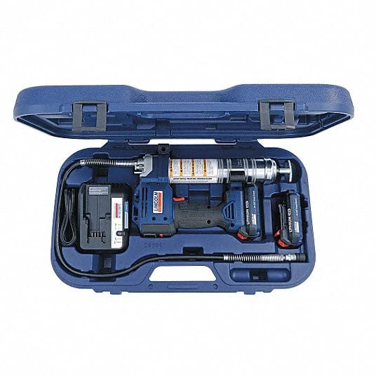 Accessories include a 36-inch high-pressure flex hose with spring guard which makes it easier to lubricate hard-to-reach fittings, a 120 V charger, (2) 20 V Li-Ion rechargeable battery and a heavy-duty carrying case molded from impact- and stain-resistant plastic.