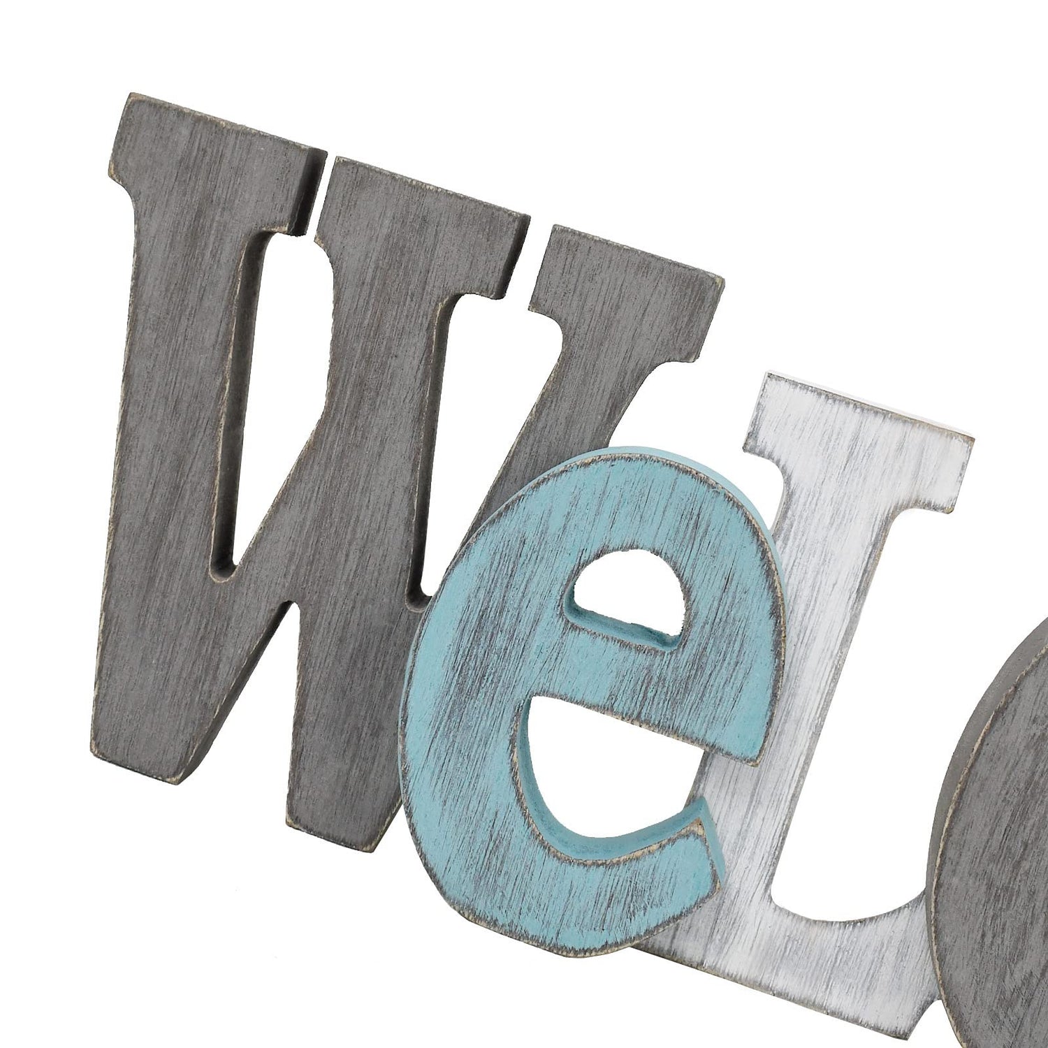 - DECORATIVE LETTERS SIGN: Multicolor welcome sign is painted in faint white, gray and aqua color, which give the letters a rustic vintage appearance. Wood block letters sign matches any farmhouse or country design style.