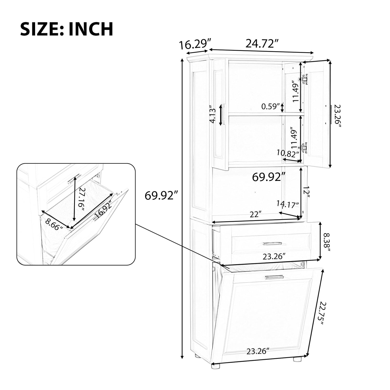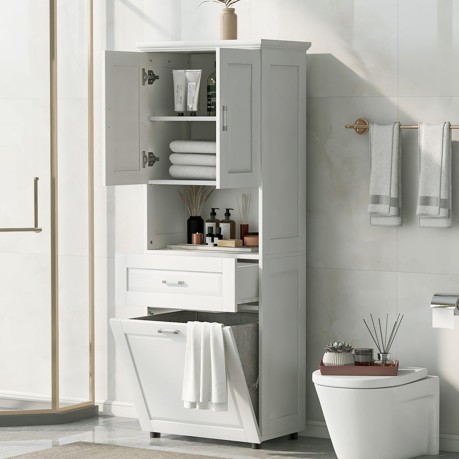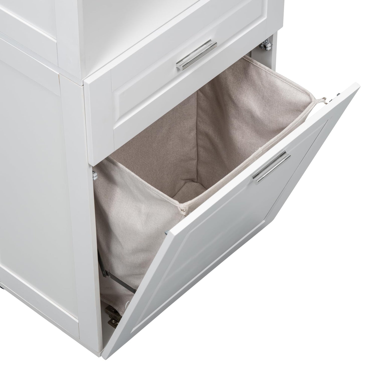 Details: Linique 69.25"H Tall Bathroom Cabinet with Tilt-Out Laundry Hamper Basket and Upper Storage,Storage Cabinet with Two Doors,Adjustable Shelf and Drawer(White)