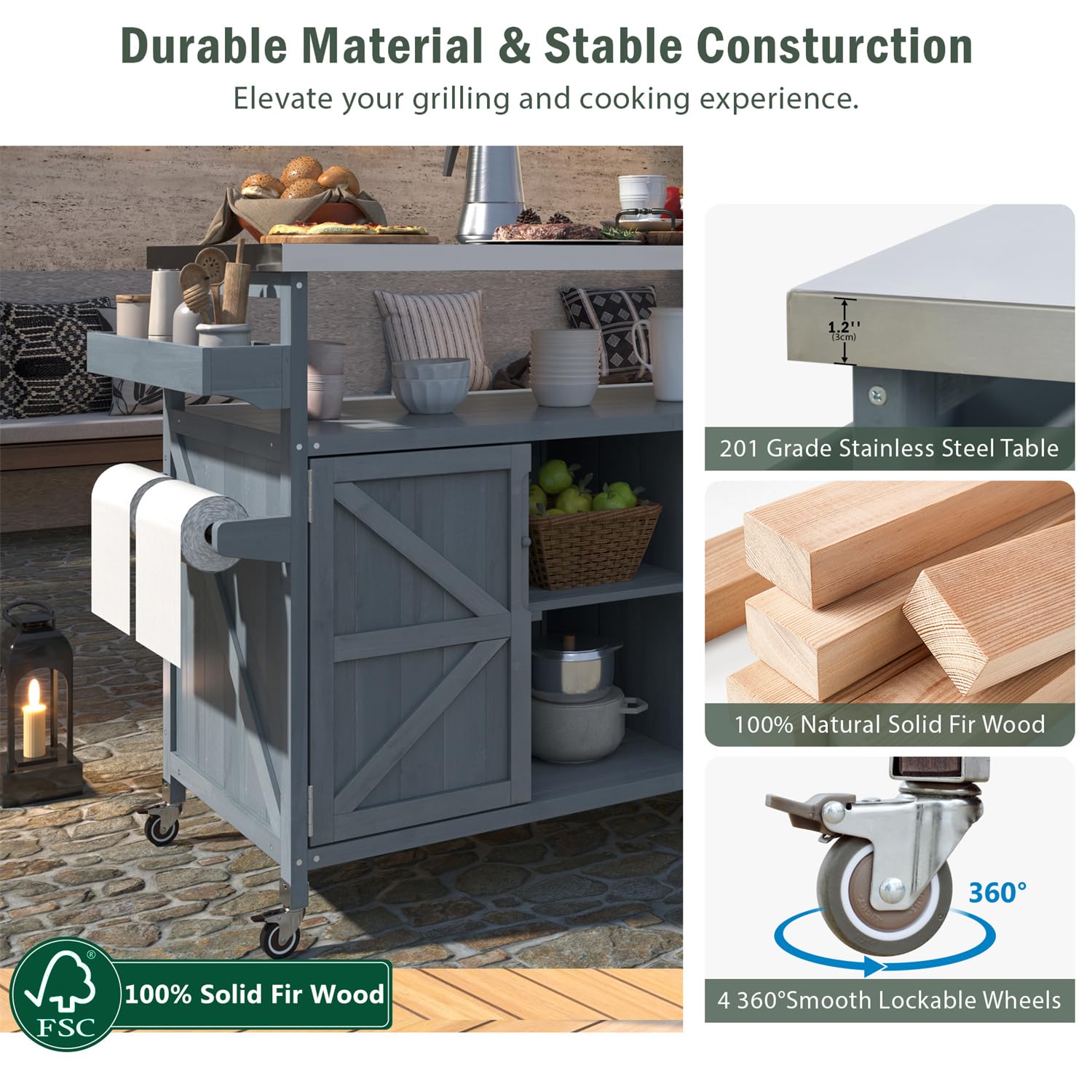 - [Heavy Duty Structure] Crafted from 100% exquisite fir wood, this outdoor bar cart exudes natural charm while prioritizing skin-friendliness and minimal chemical coatings. The 1.2-inch thick 201 stainless steel tabletop offers an easy-to-clean and durable spacious grill table for preparing food ready for cooking. Exclusively designed in your house, we guarantee a long-lasting and sturdy product.