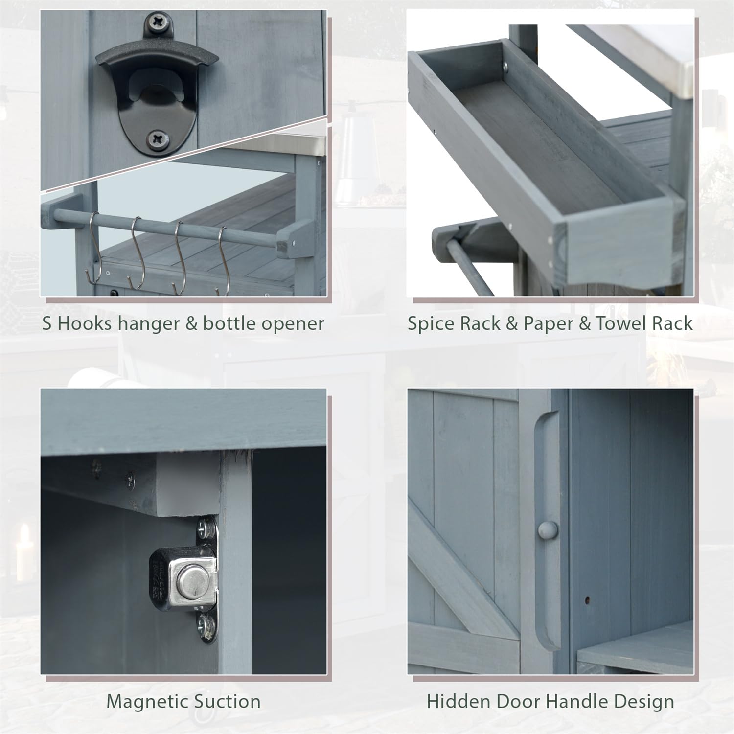 Details: Linique Outdoor Kitchen Island, Rolling Bar Cart with Storage Cabinet, Farmhouse Solid Wood Outdoor Grill Table with Stainless Steel Top, Spice Rack, Towel Rack for Yard, Patio, Grey Blue